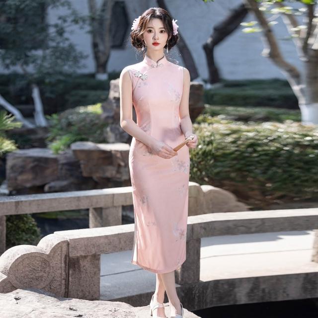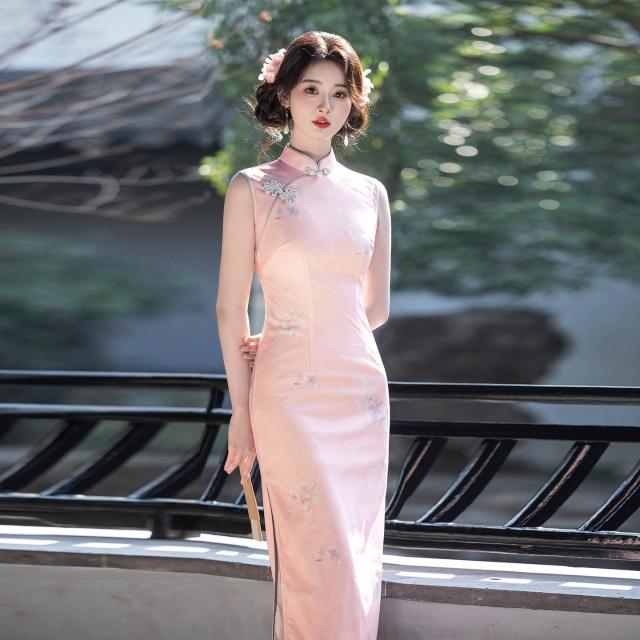 高端刺繡粉色旗袍2026新款女夏季新中式訂婚禮服裙改良無袖年輕款