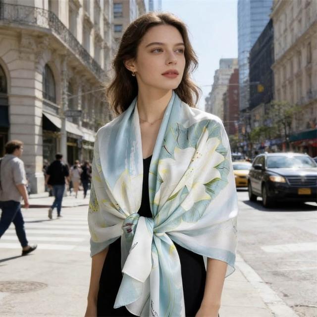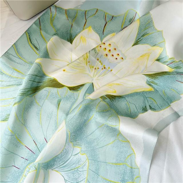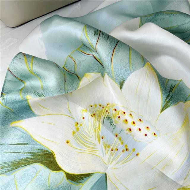 氣質荷花錦鯉真絲圍巾女春秋季韓版百搭夏季長薄款桑蠶絲防曬披肩