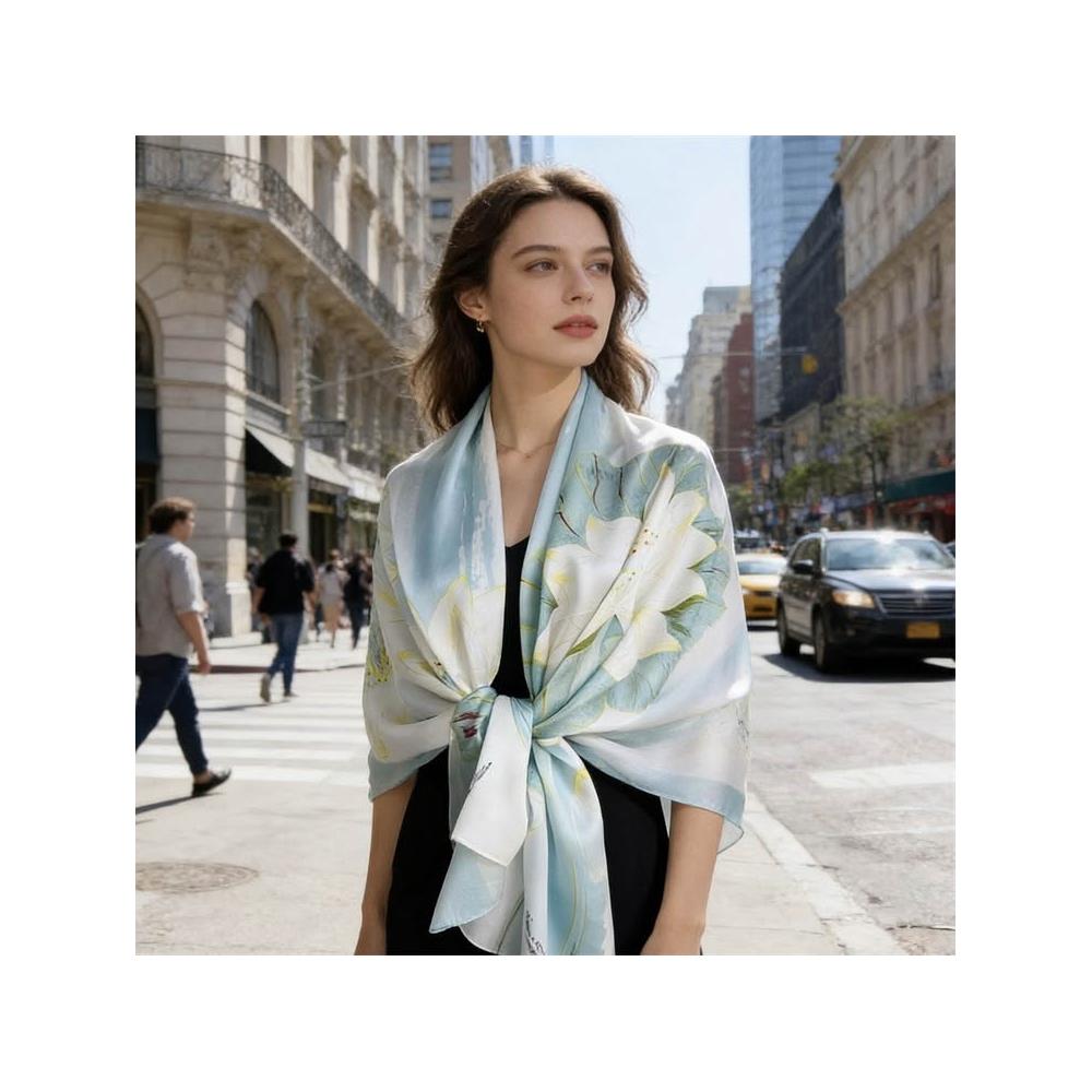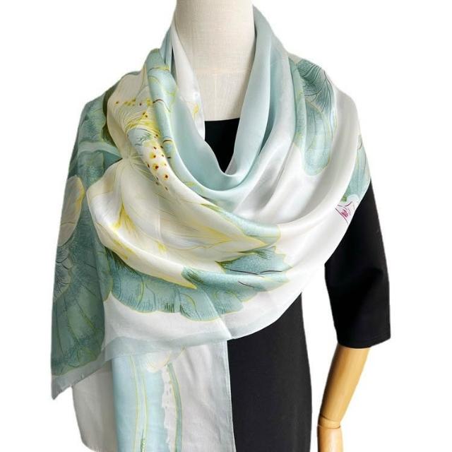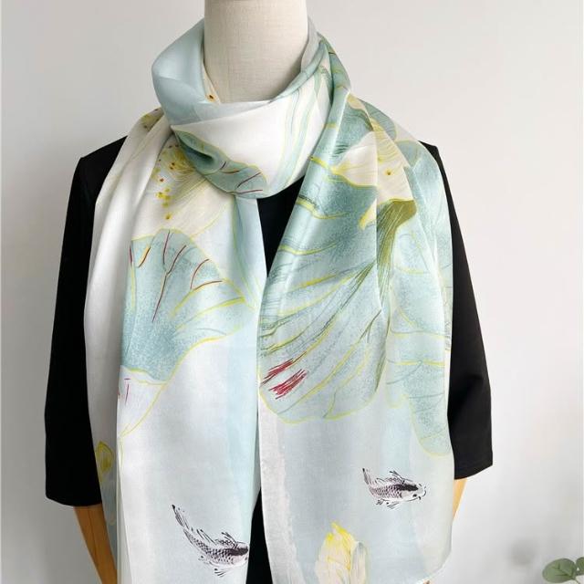 氣質荷花錦鯉真絲圍巾女春秋季韓版百搭夏季長薄款桑蠶絲防曬披肩