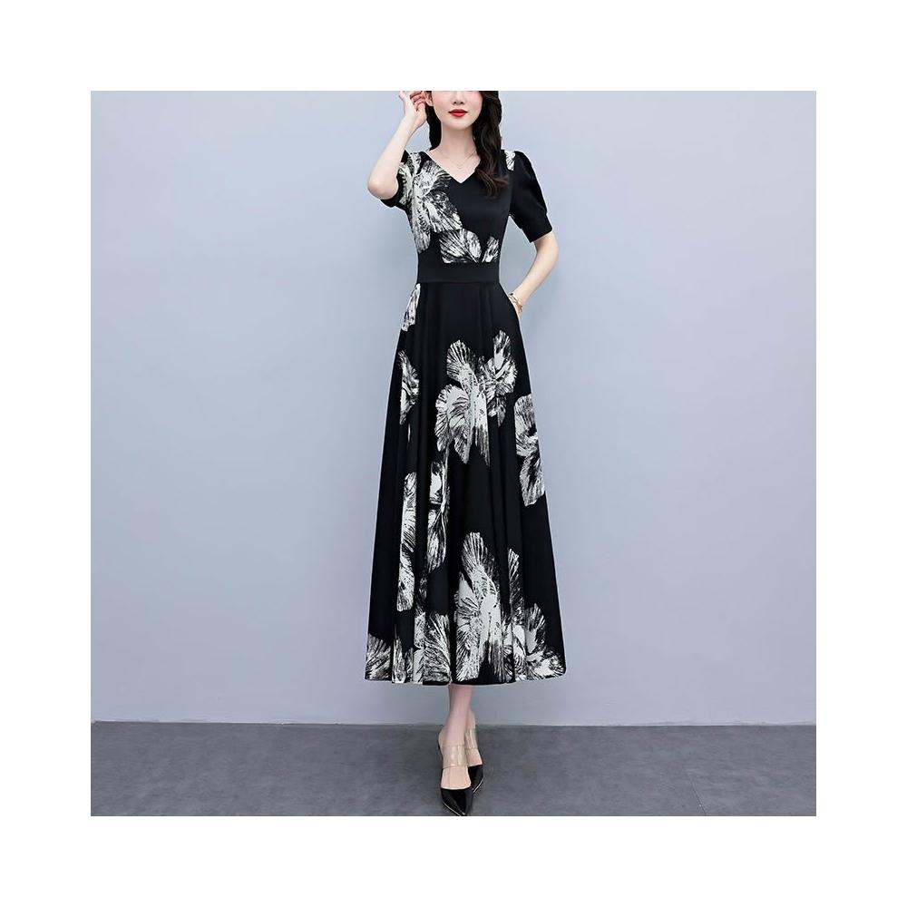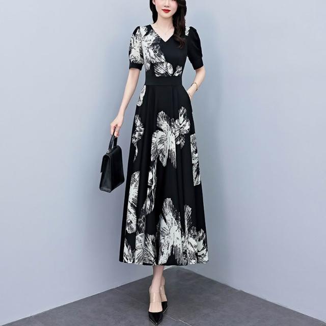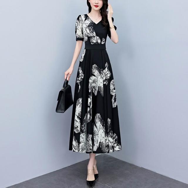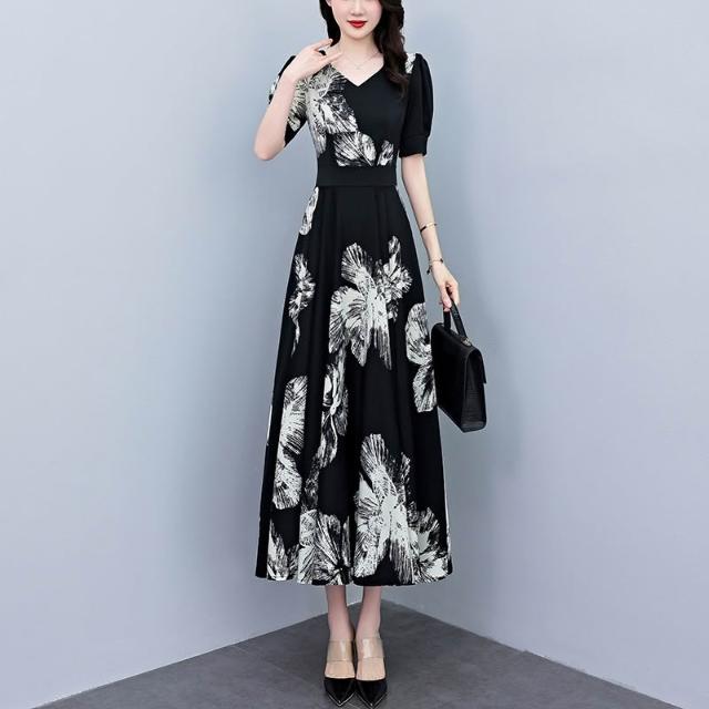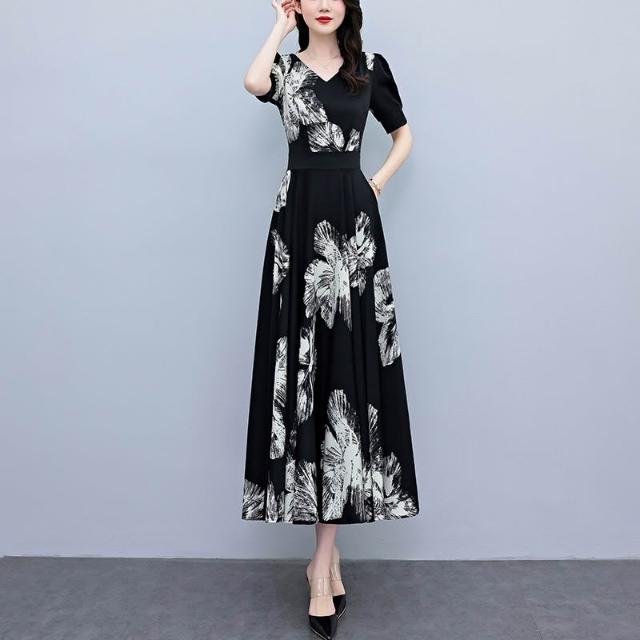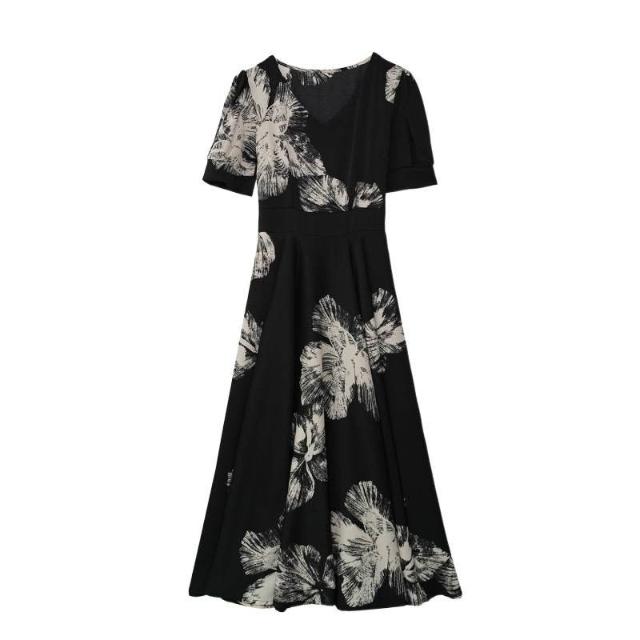 歐萊時尚優雅印花黑色連衣裙女2026夏季新款收腰顯瘦遮肚長裙