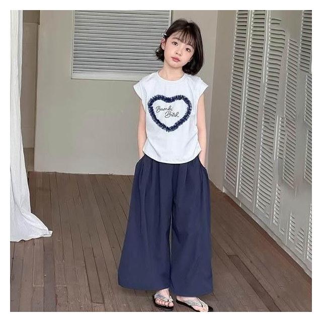 優先購女童夏裝2026新款洋氣女孩大童愛心短袖夏季薄款休閒闊腿褲套裝潮