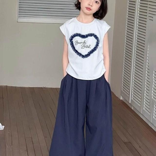 優先購女童夏裝2026新款洋氣女孩大童愛心短袖夏季薄款休閒闊腿褲套裝潮