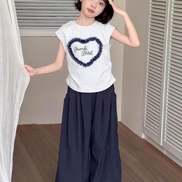 優先購女童夏裝2026新款洋氣女孩大童愛心短袖夏季薄款休閒闊腿褲套裝潮