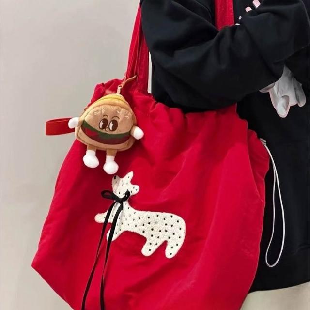 優先購新款小狗紅色帆布包慵懶學生刺繡通勤百搭單肩抽繩大容量托特包
