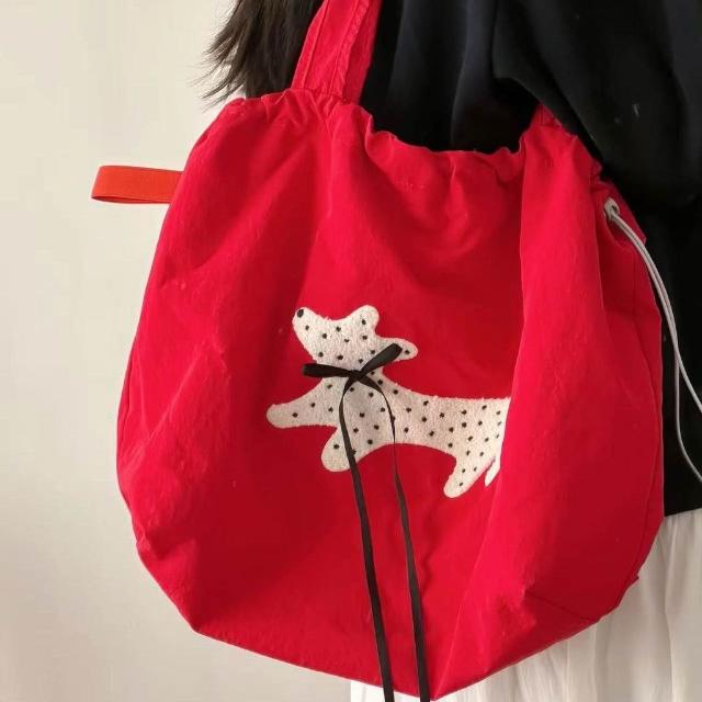 優先購新款小狗紅色帆布包慵懶學生刺繡通勤百搭單肩抽繩大容量托特包
