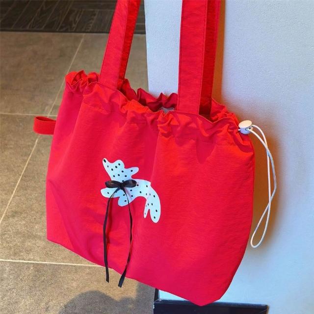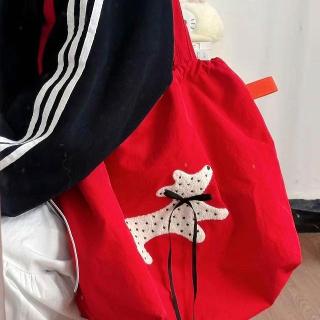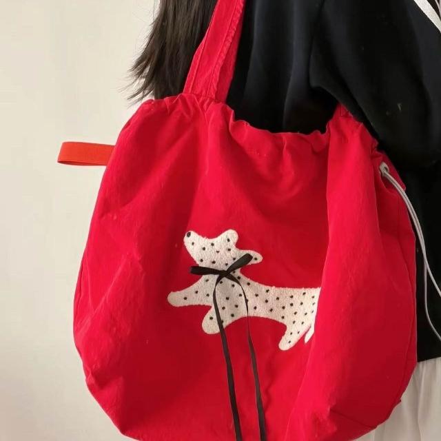優先購新款小狗紅色帆布包慵懶學生刺繡通勤百搭單肩抽繩大容量托特包