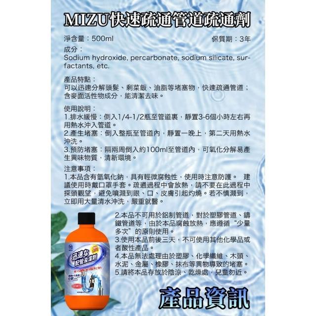 台灣現貨-日本MIZU水管疏通劑 大容量500ml|快速除臭去堵 廚房浴室必備 通水管 管道清潔 水管疏通 疏通
