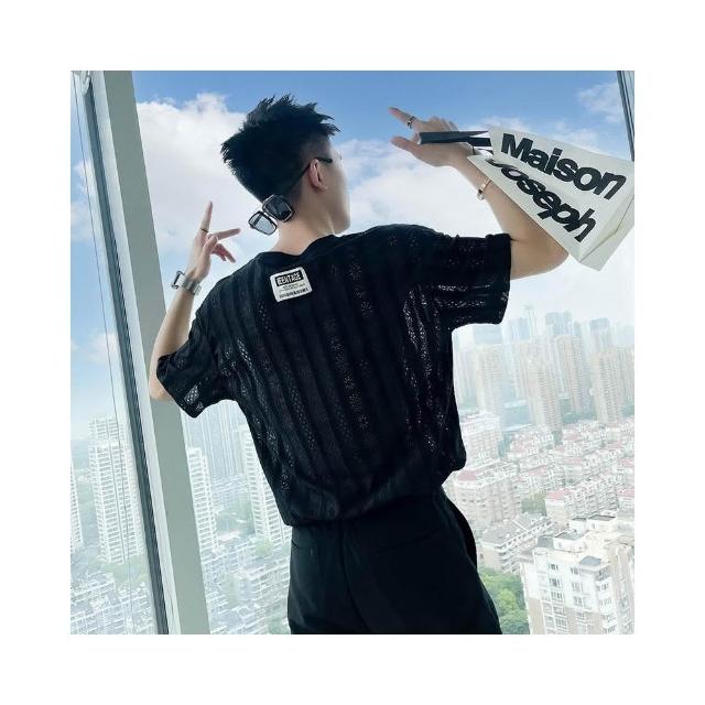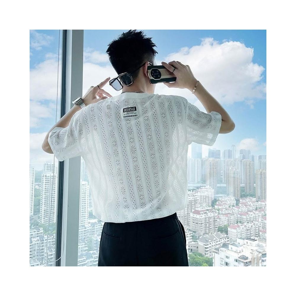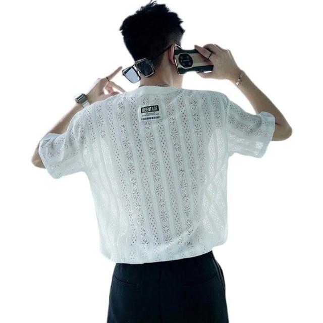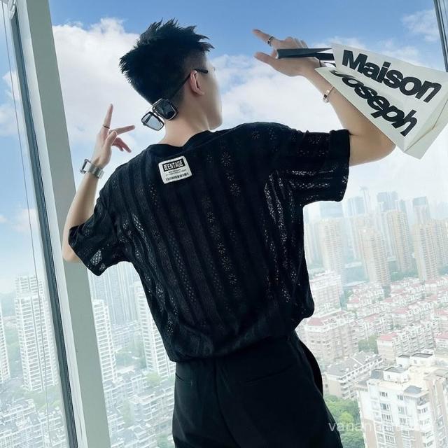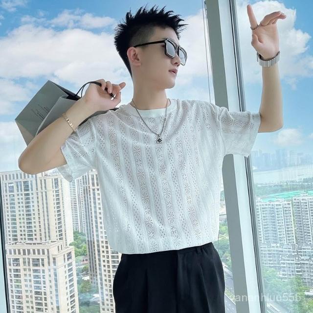 夏季冰絲鏤空T恤男短袖ins潮牌痞帥男裝衣服2025新款潮流寬鬆半袖
