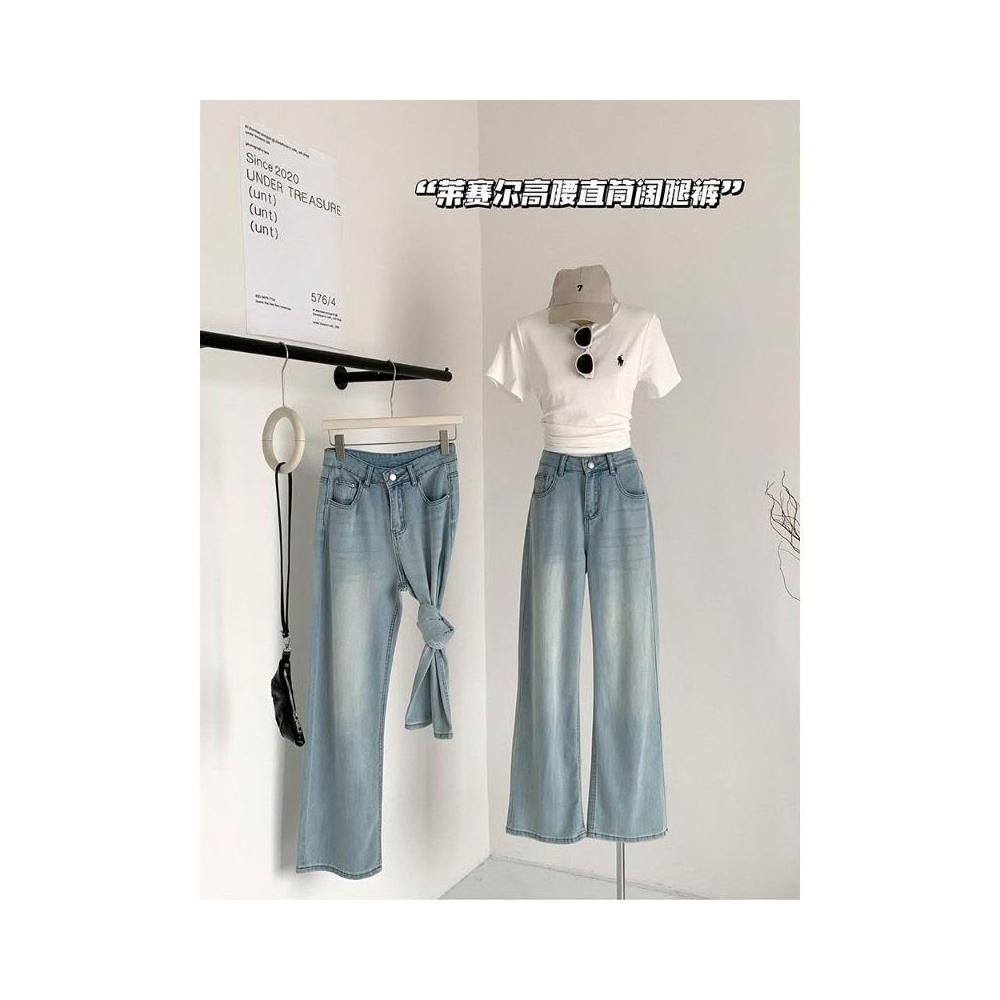 贝贝嚴選萊賽爾涼感淺藍闊腿牛仔褲女2026年春夏新款軟牛仔高腰寬鬆直筒褲