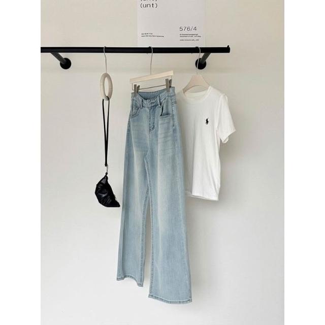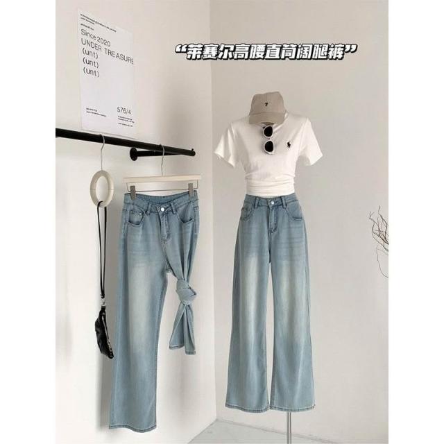 贝贝嚴選萊賽爾涼感淺藍闊腿牛仔褲女2026年春夏新款軟牛仔高腰寬鬆直筒褲