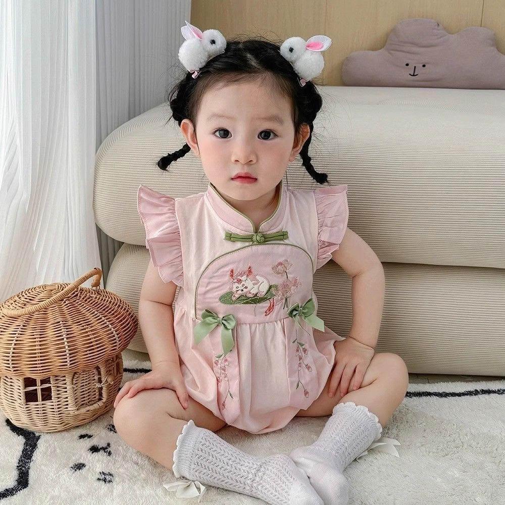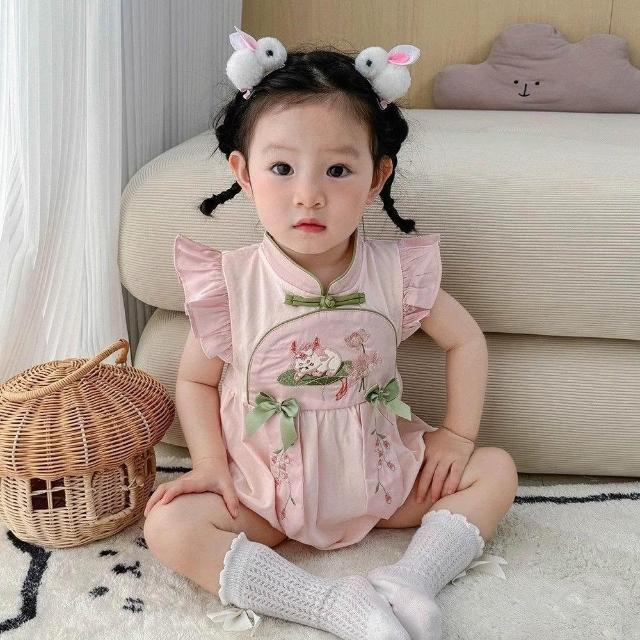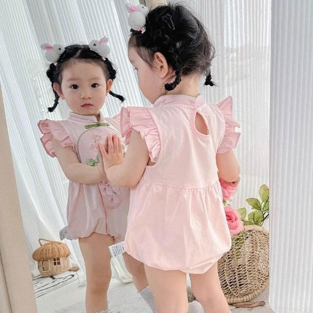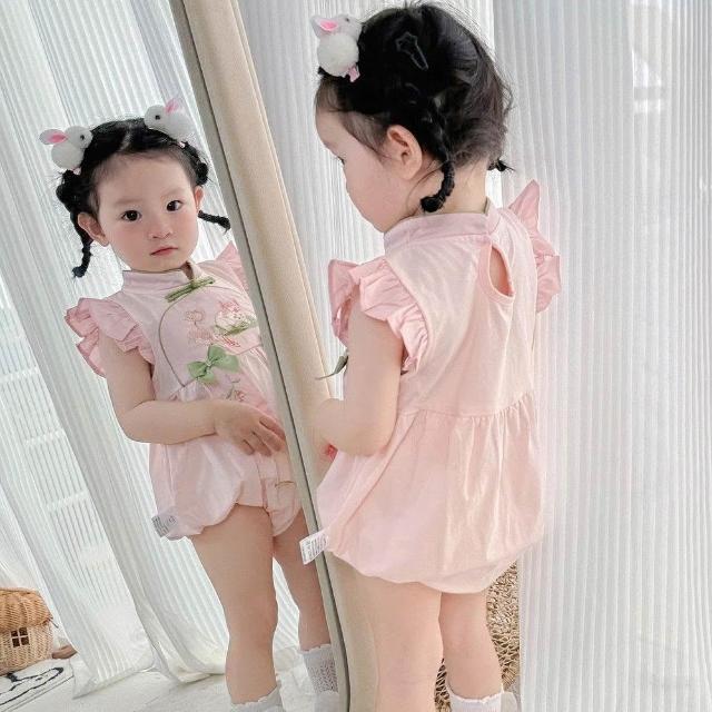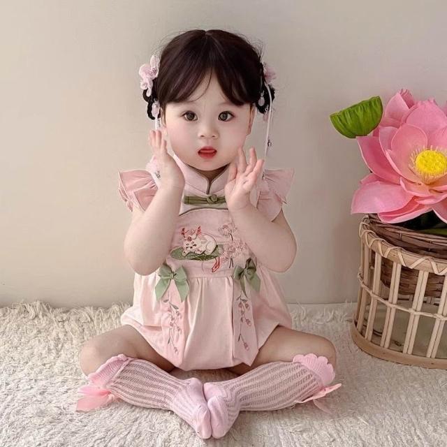 贝贝嚴選夏季嬰兒女寶寶包屁衣刺繡粉色國風小旗袍外出服爬爬服生日宴哈衣