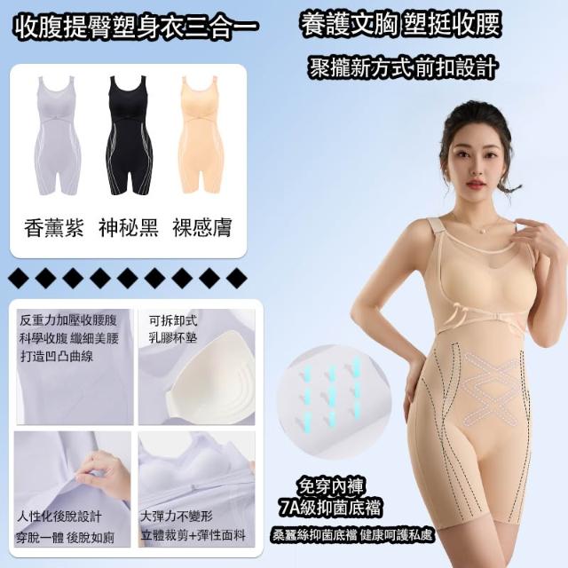 兩件組/魚子醬精華5倍塑型托胸帶升級款連體塑身内衣/黑綳帶强力收腹提臀美胸内衣/7A桑蠶絲抗菌棉襠/可拆卸連體杯墊連體衣