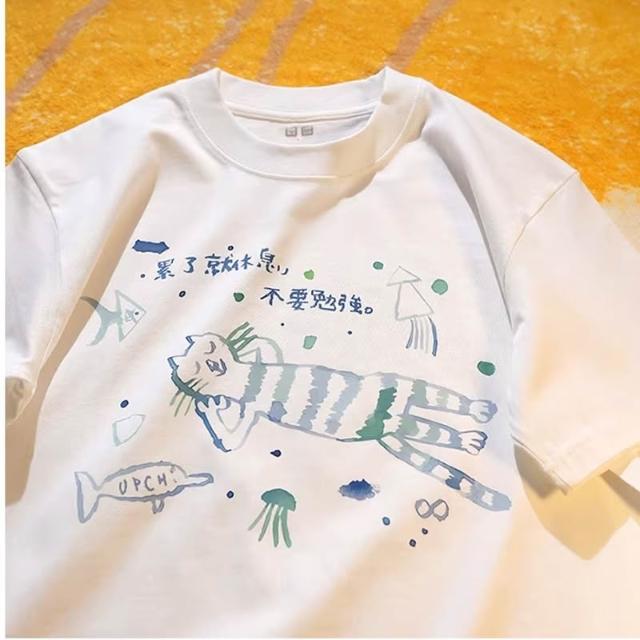 了就休息 不要勉強 徜徉海洋貓純棉 短T 情侶T【Y1244MIT 情侶裝 短袖T恤 班服 加大尺碼 男女可穿 快速