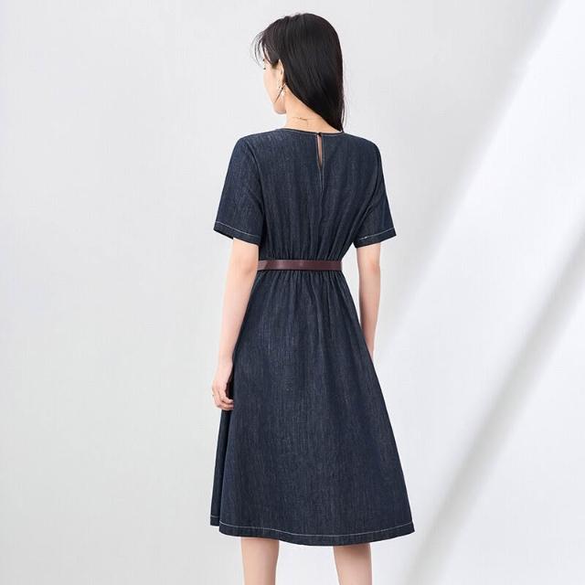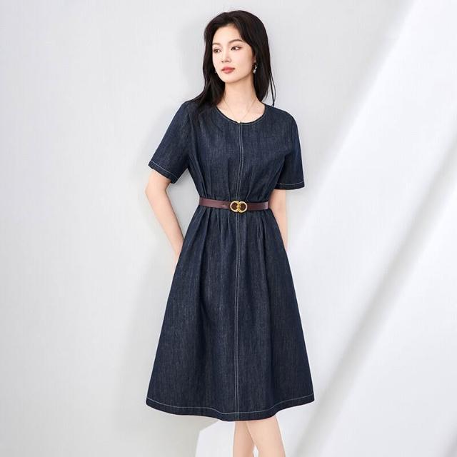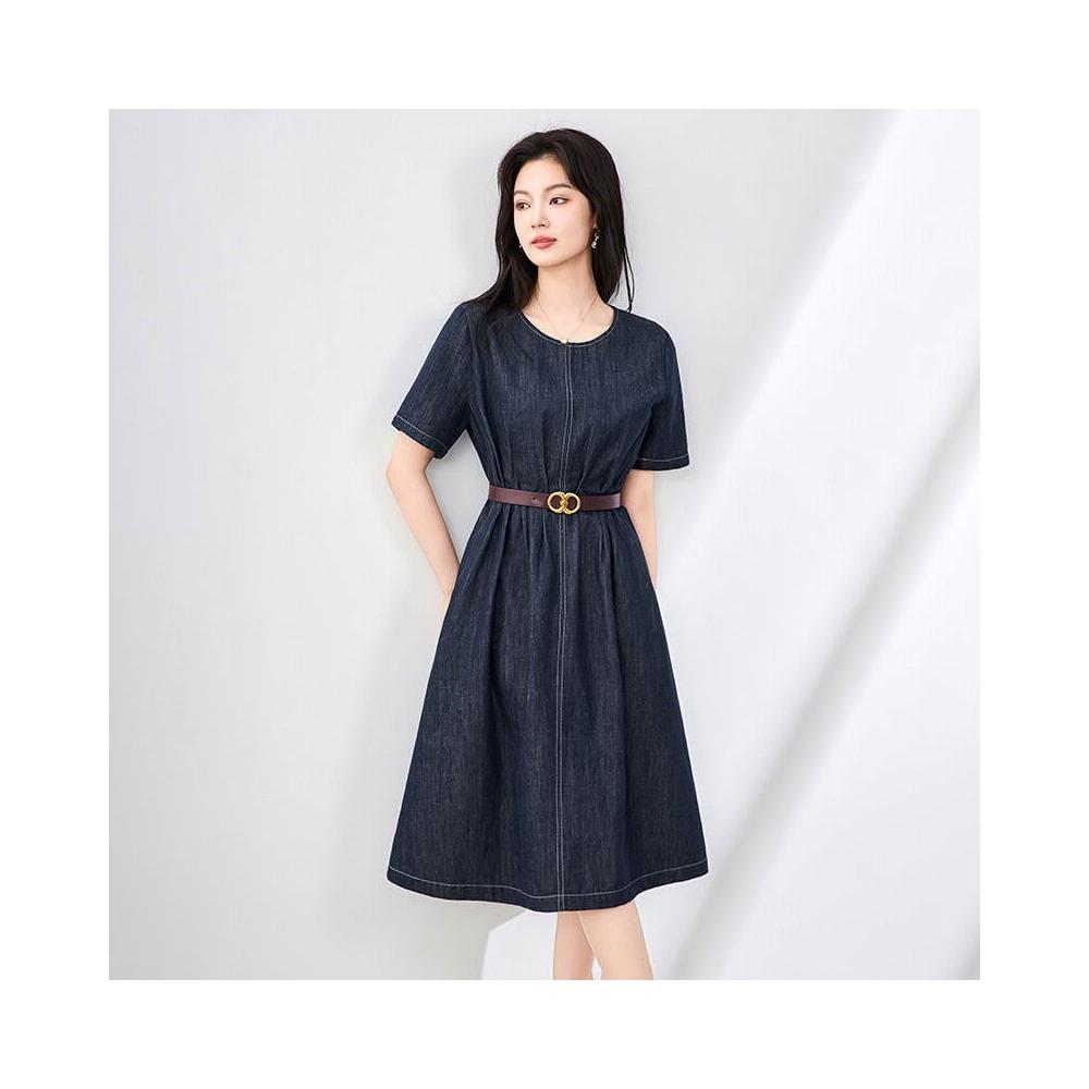 含税 2507711-深圳南油高貨褶皺收腰顯瘦遮肉牛仔連衣裙大擺短袖圓領女