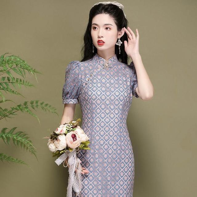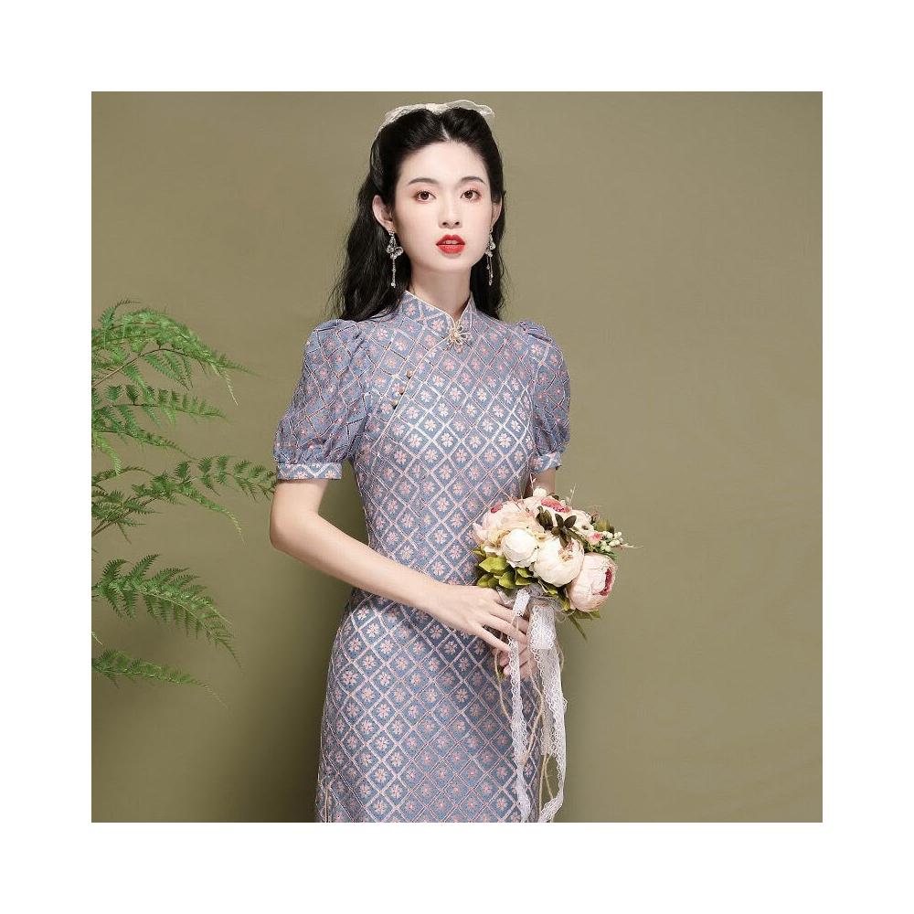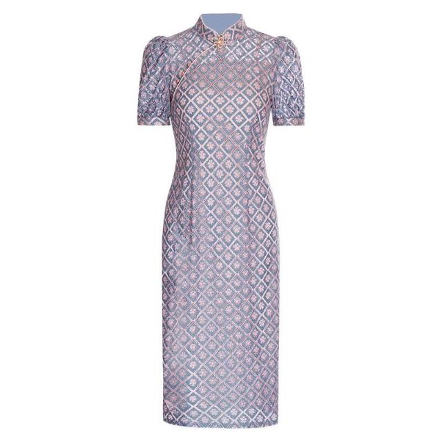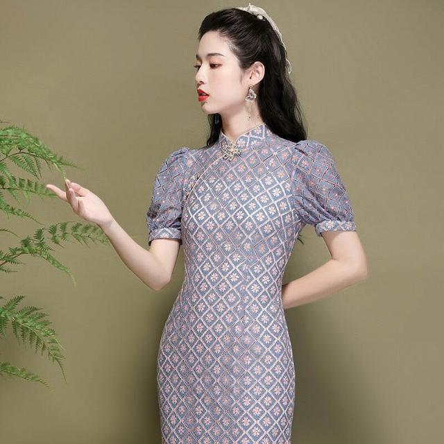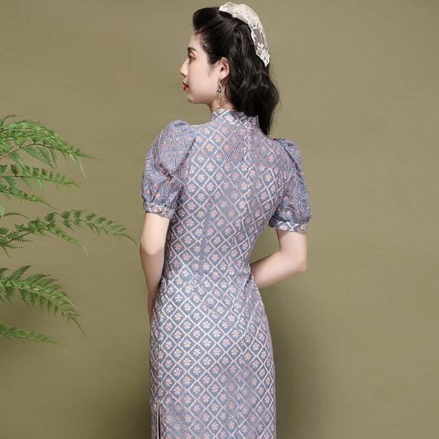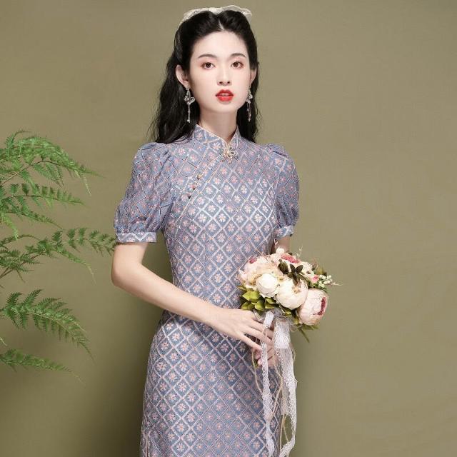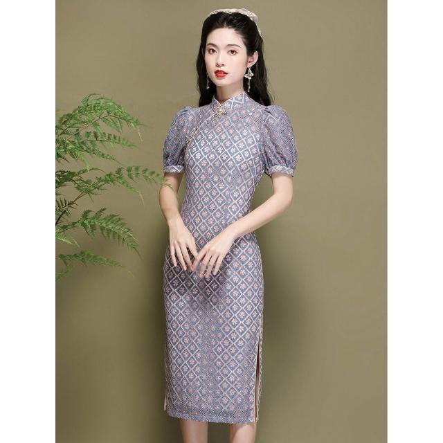含税 改良旗袍中國風燈籠袖氣質年輕款蕾絲顯瘦連衣裙220291