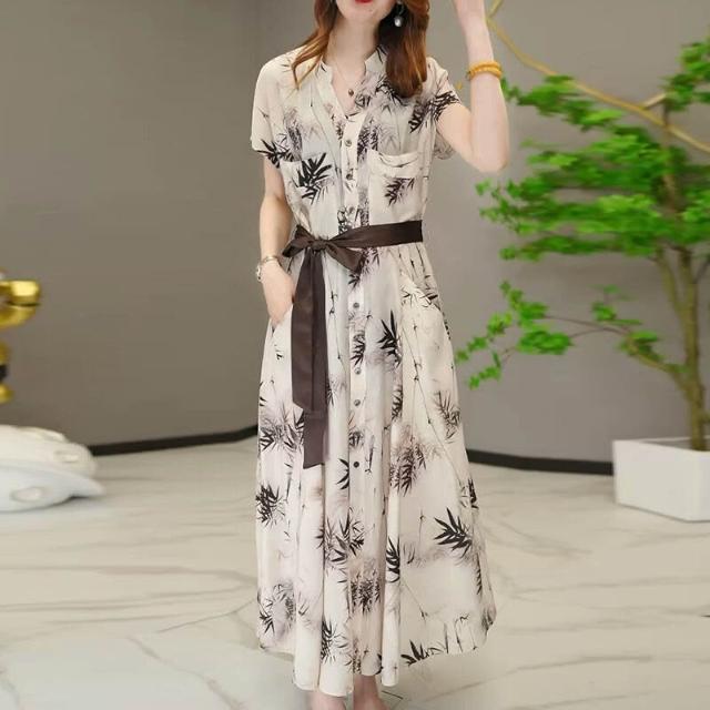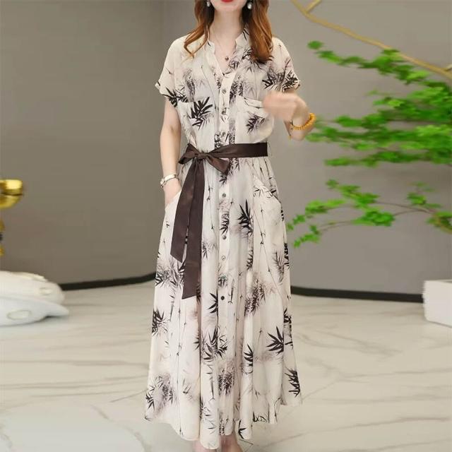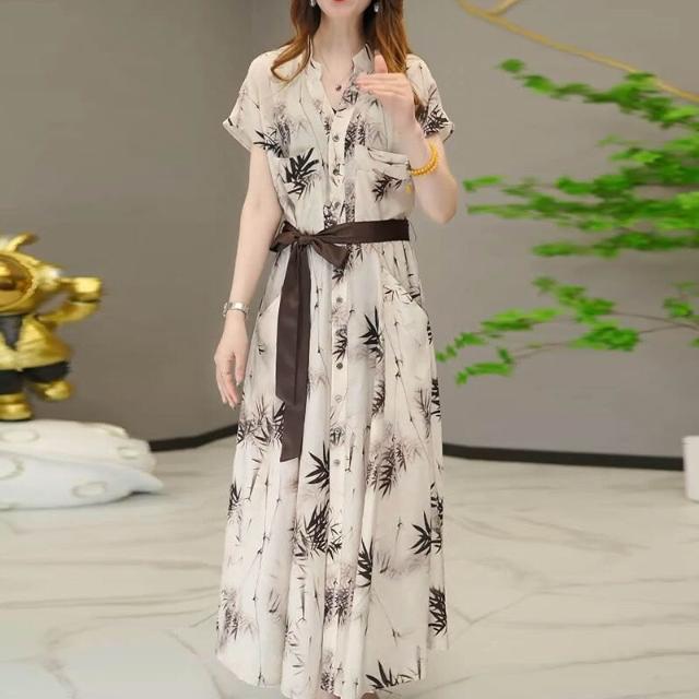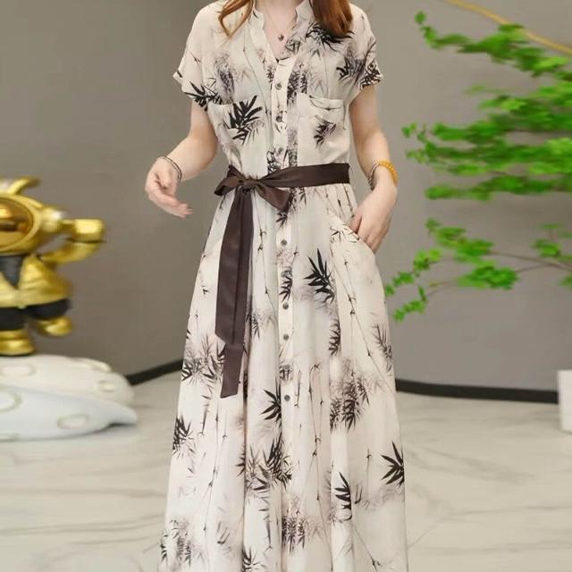 含税 高定款夏季新款時尚顯瘦連衣裙子國風水墨暈染中長款連衣裙子