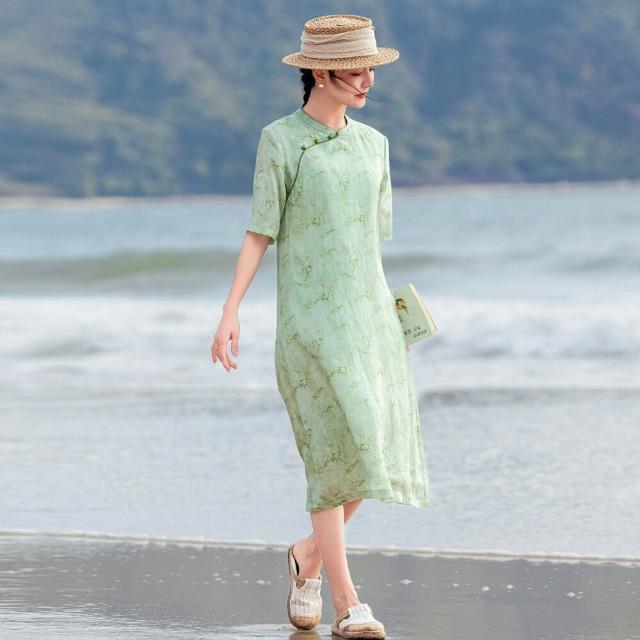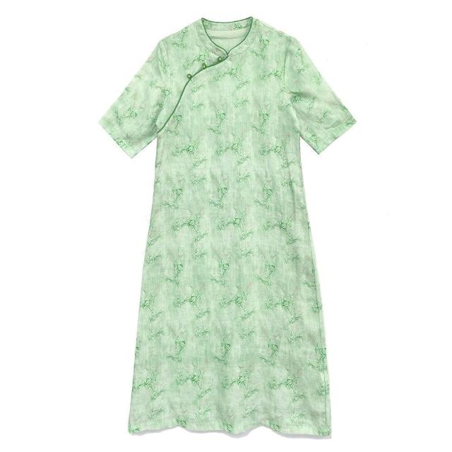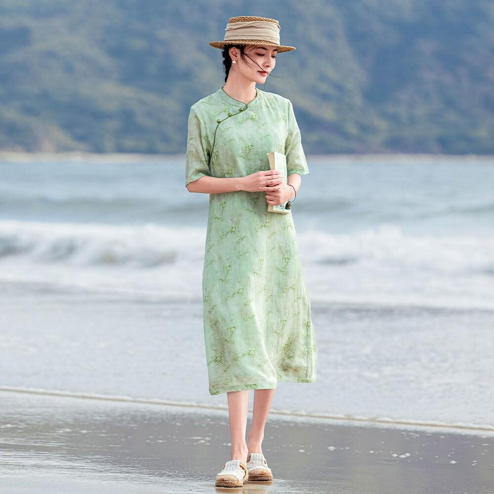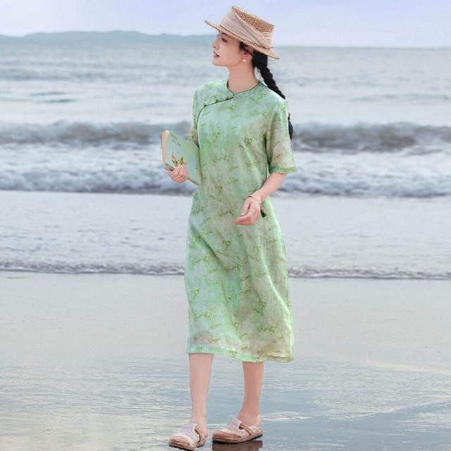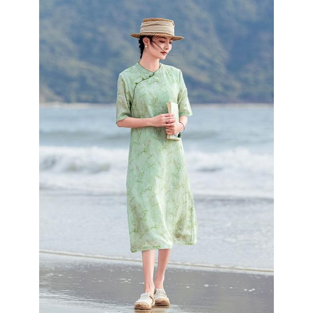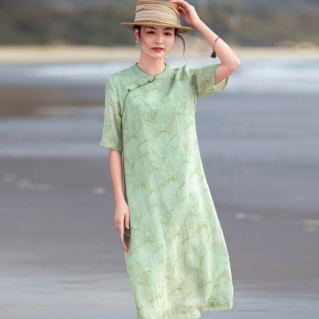 含税 25夏新款高品質改良旗袍裙苎麻印花立領斜襟中袖文藝中國風連衣裙