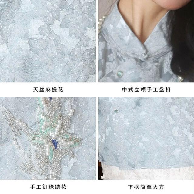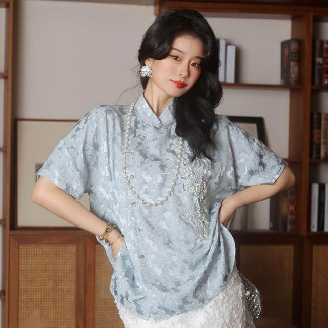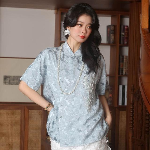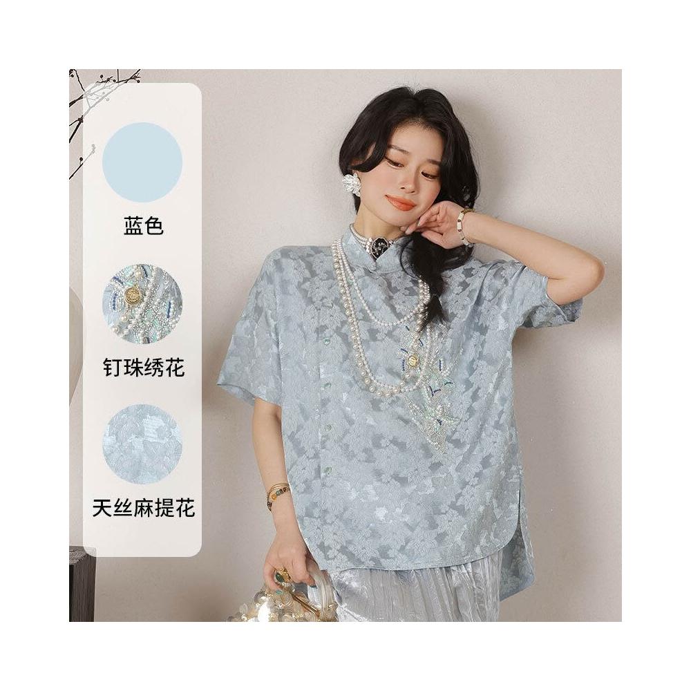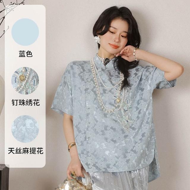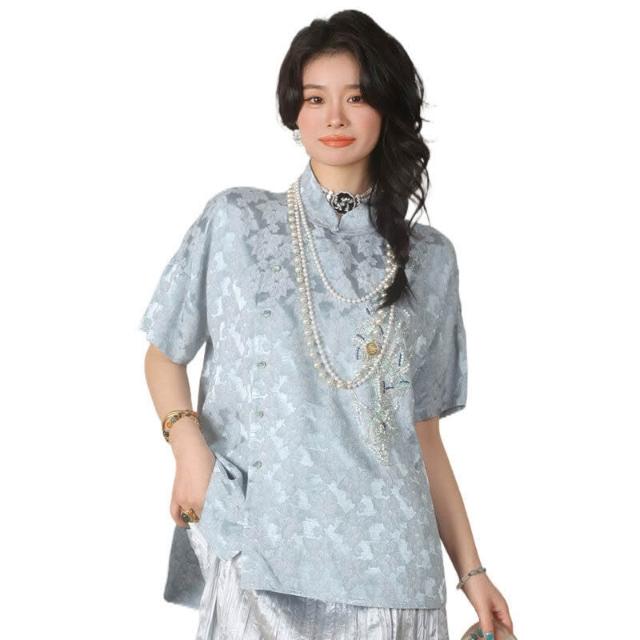 含税 2025夏季款新中式國風提花緞面圓領上衣寬松襯衫文藝範女T恤