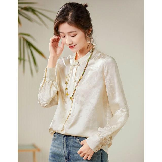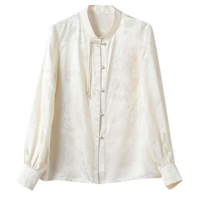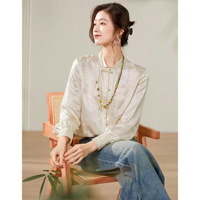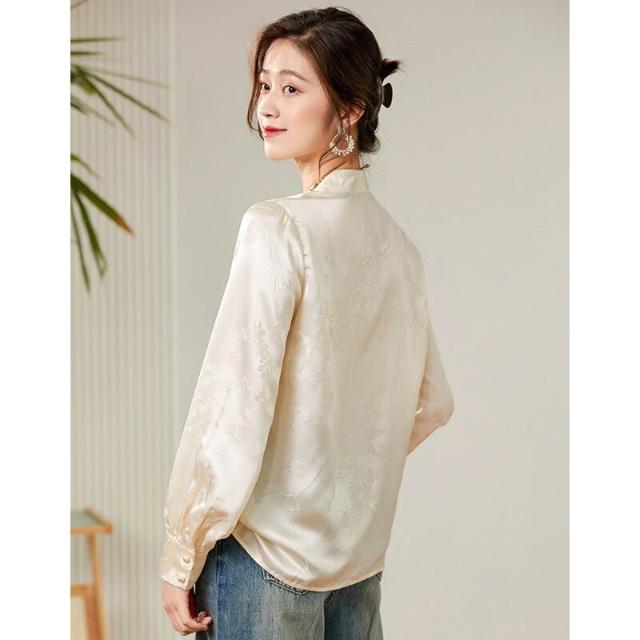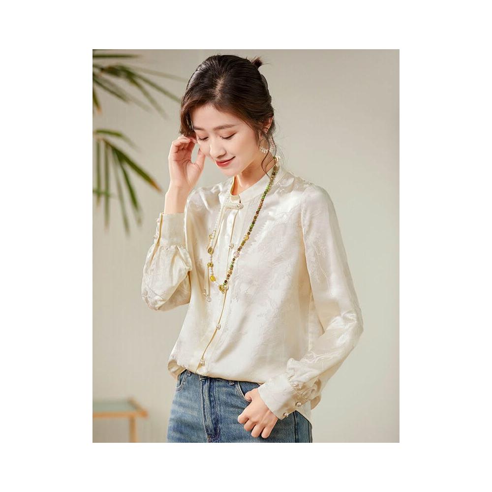 含税 26姆米桑蠶絲重工提花襯衫女裝25秋季新中式國風盤扣立領真絲上衣