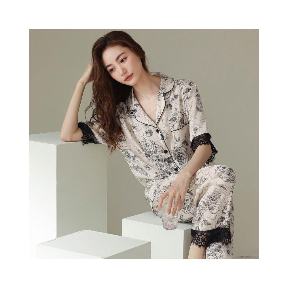 含税 新款冰絲睡衣女士短袖長褲夏季薄款大碼套裝高級感仿真絲綢家居服