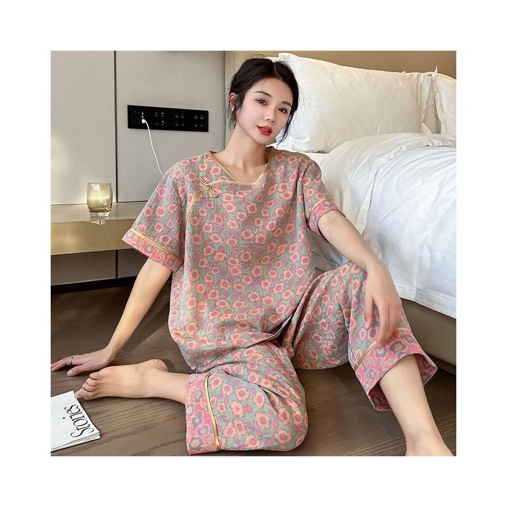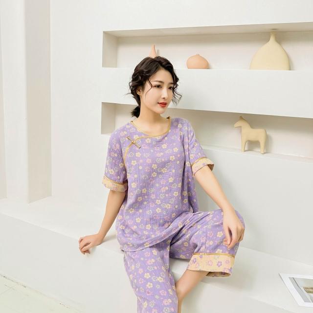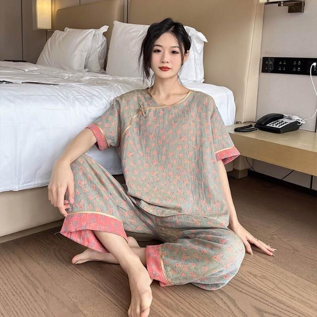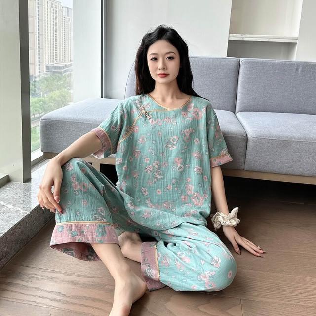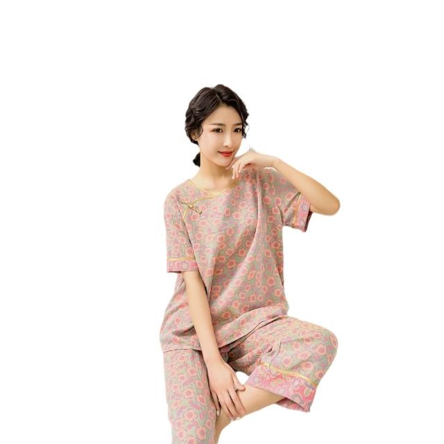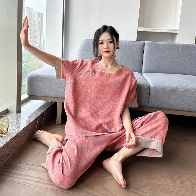 含税 國風睡衣女款大碼純棉200斤胖mm新中式棉紗短袖九分褲家居服春夏