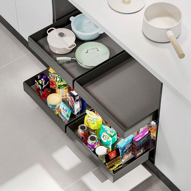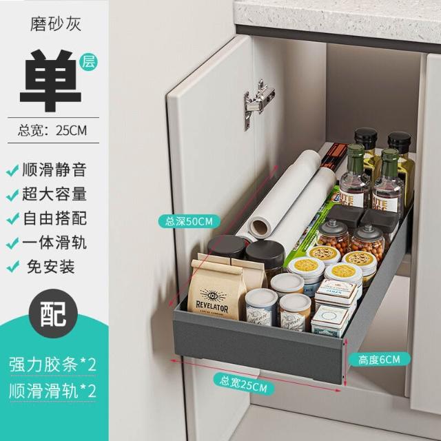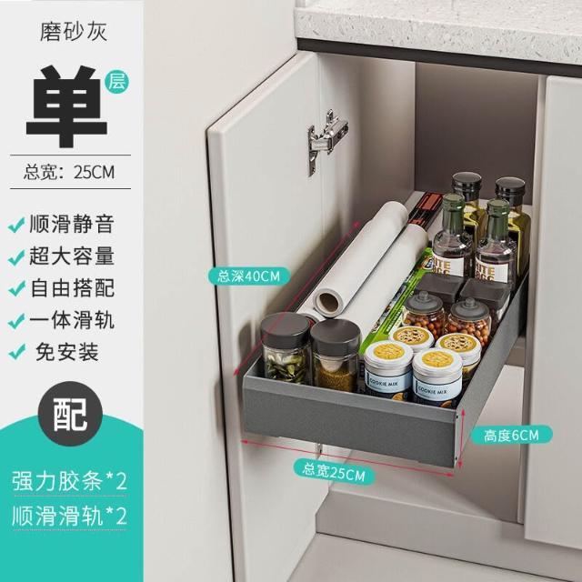 櫥櫃拉籃抽屜式免打孔底部抽拉滑軌收納廚房櫃內碗碟盤調料置物架