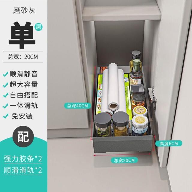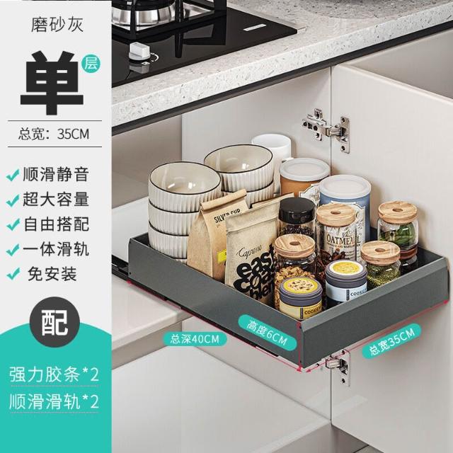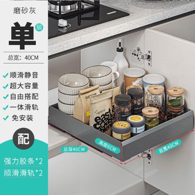 櫥櫃拉籃抽屜式免打孔底部抽拉滑軌收納廚房櫃內碗碟盤調料置物架