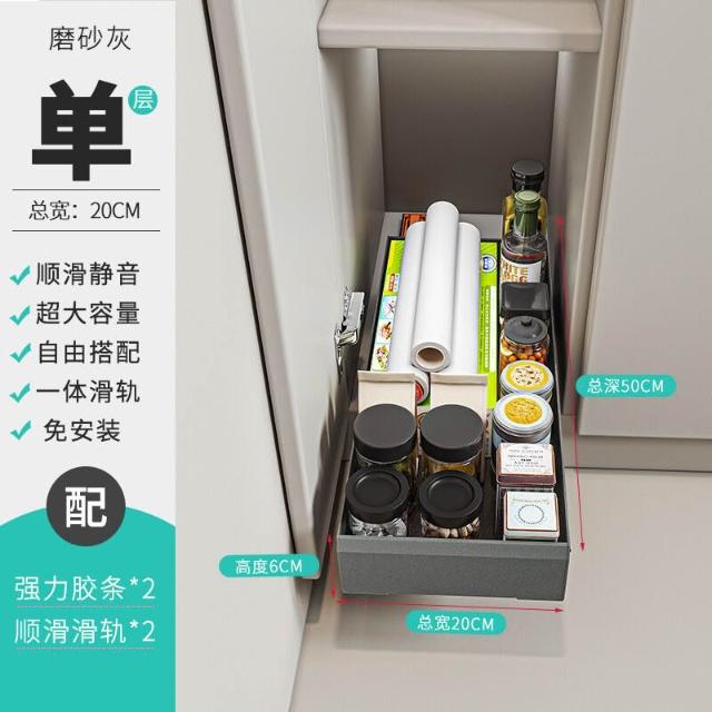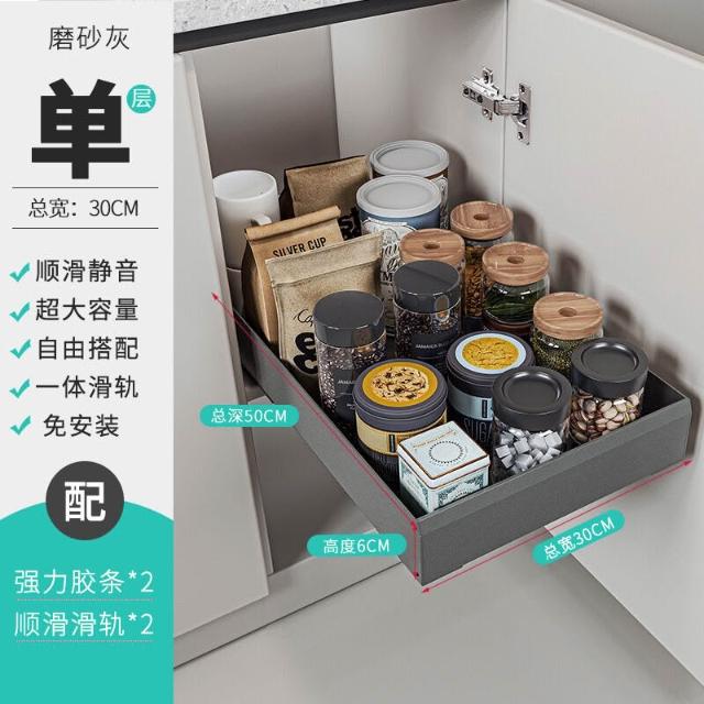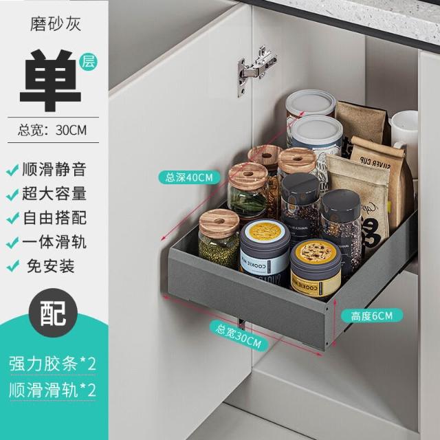櫥櫃拉籃抽屜式免打孔底部抽拉滑軌收納廚房櫃內碗碟盤調料置物架