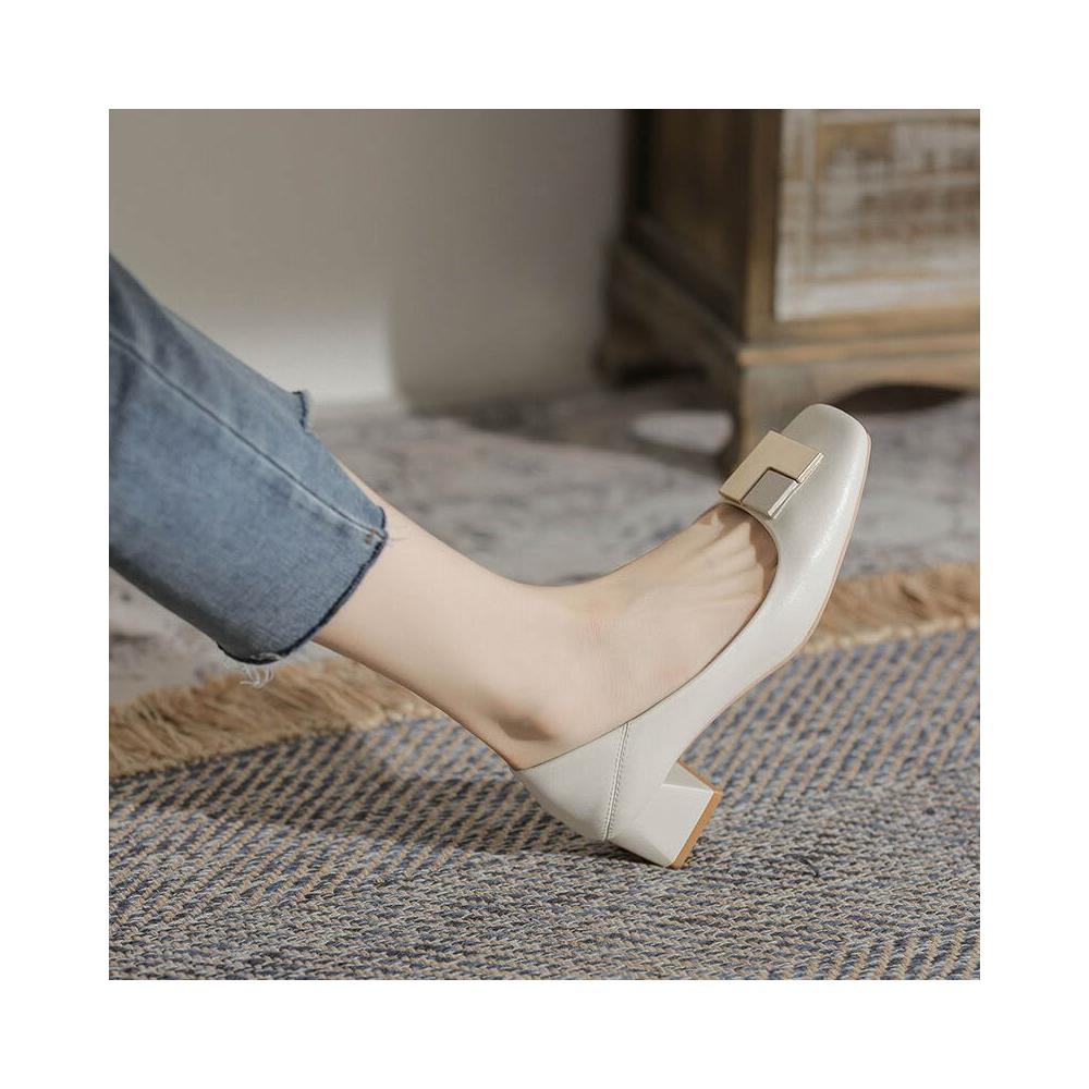 羊皮粗跟單鞋女淺口真皮倆穿2024年新款高跟鞋方頭中跟軟皮奶奶鞋