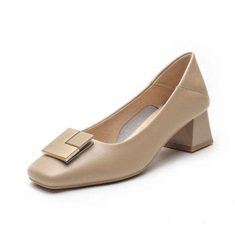 羊皮粗跟單鞋女淺口真皮倆穿2024年新款高跟鞋方頭中跟軟皮奶奶鞋