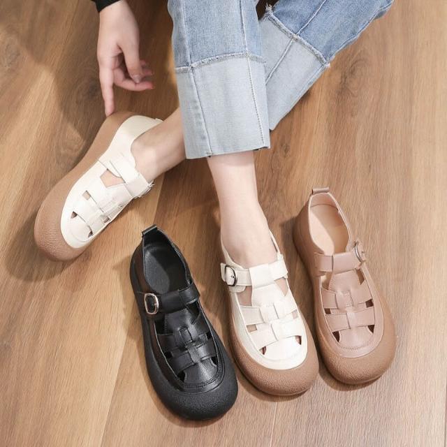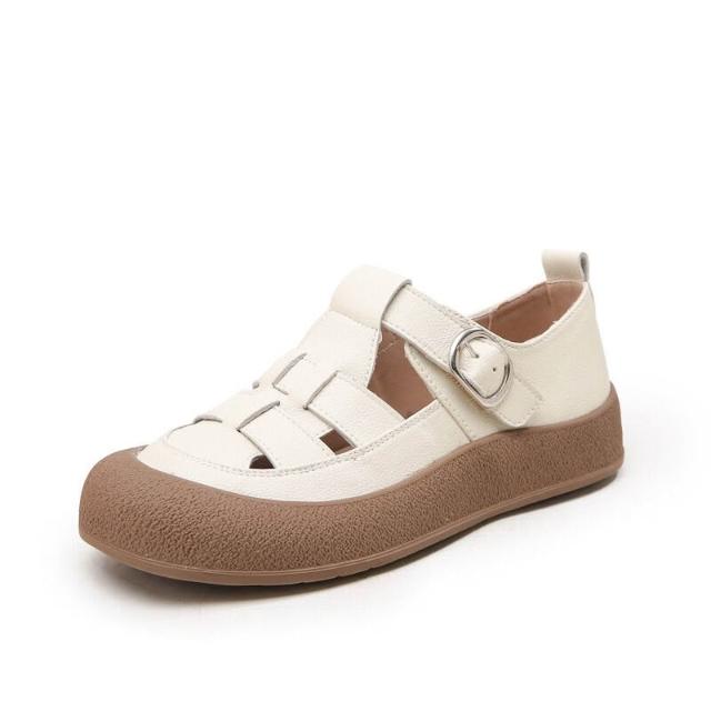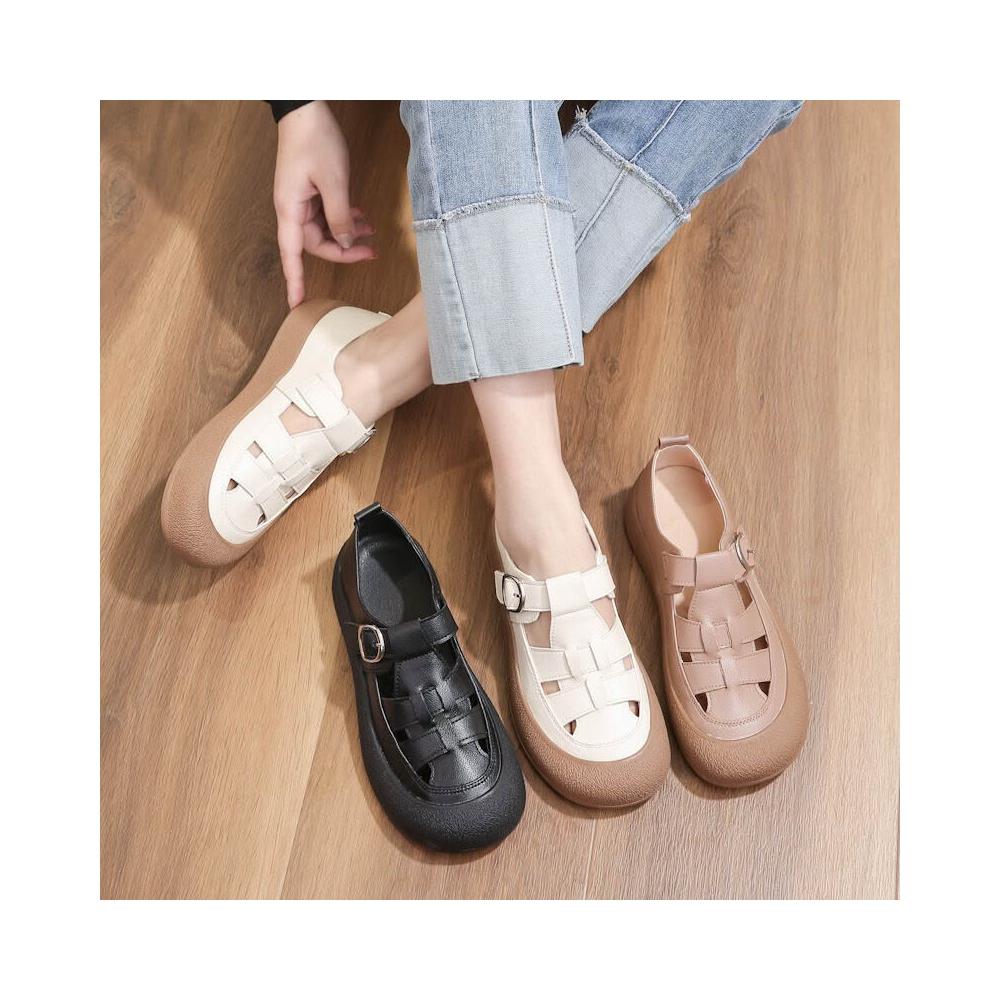新款媽媽鞋真皮軟底洞洞涼鞋女士百搭中老年人镂空平底透氣女鞋