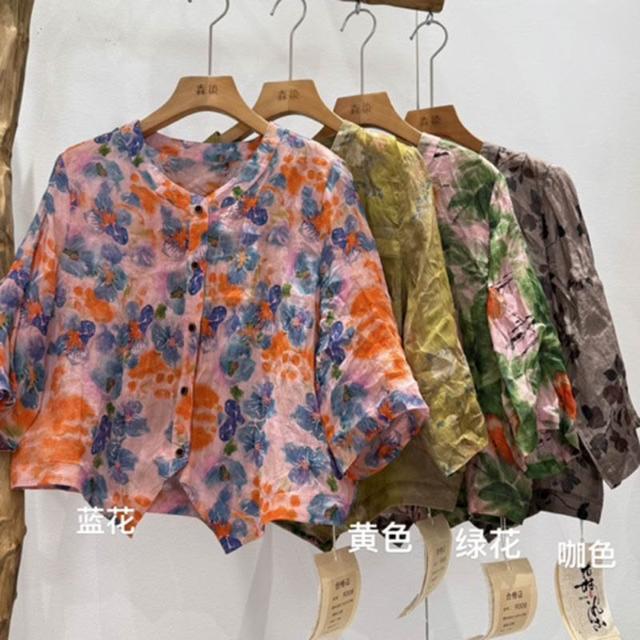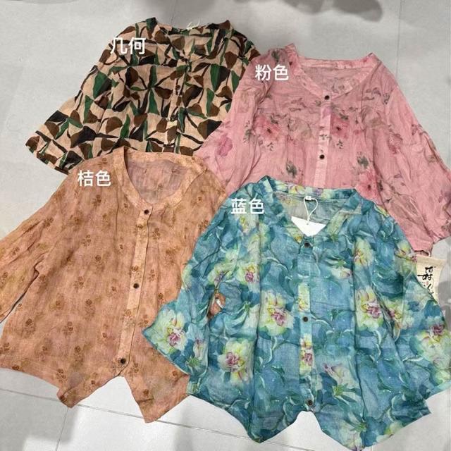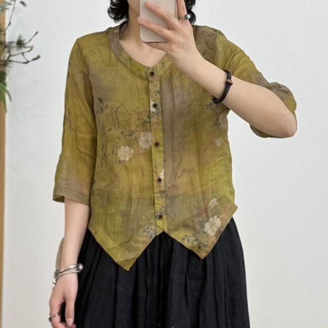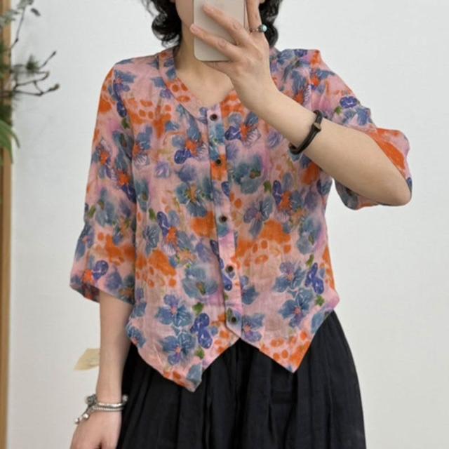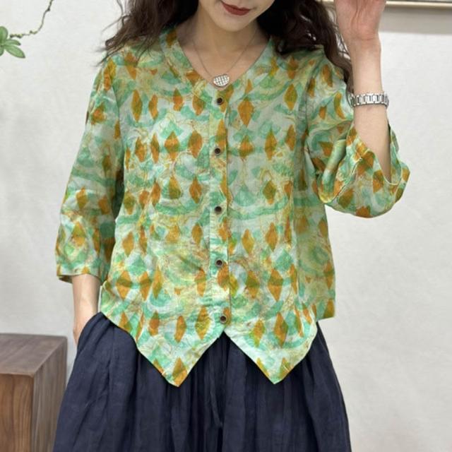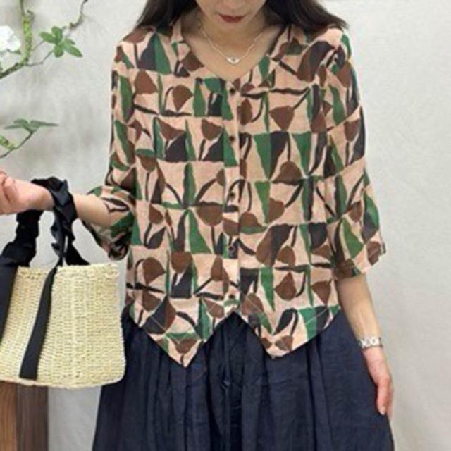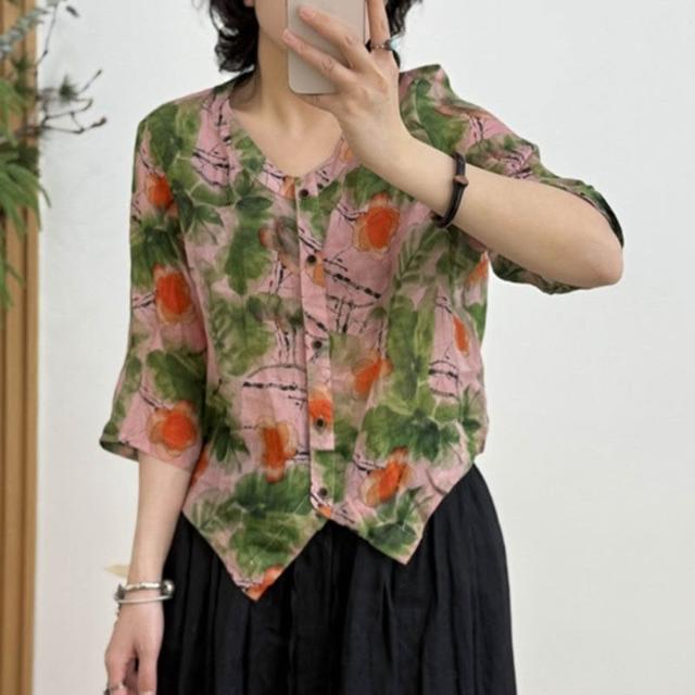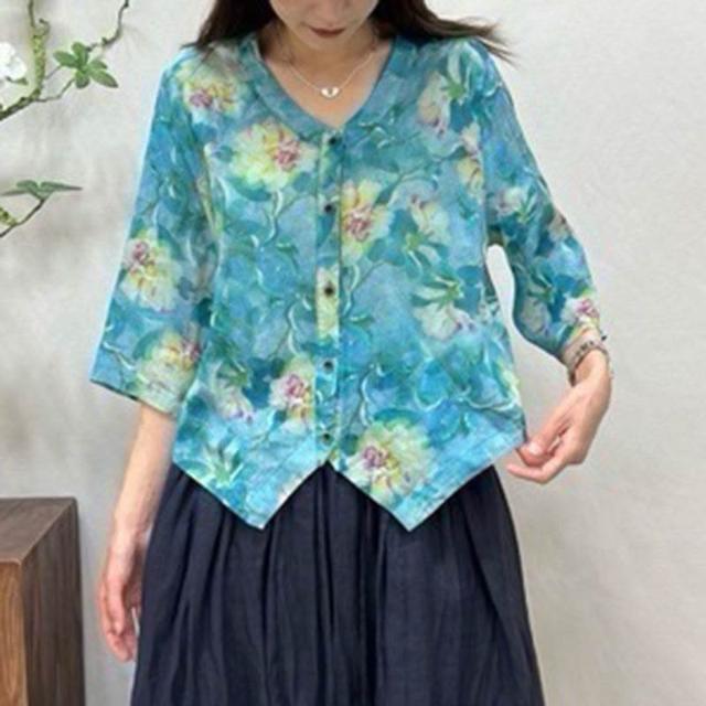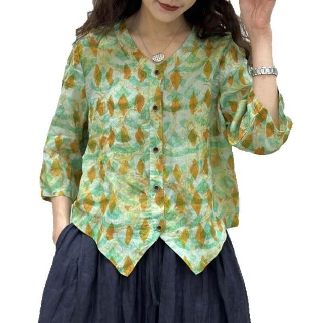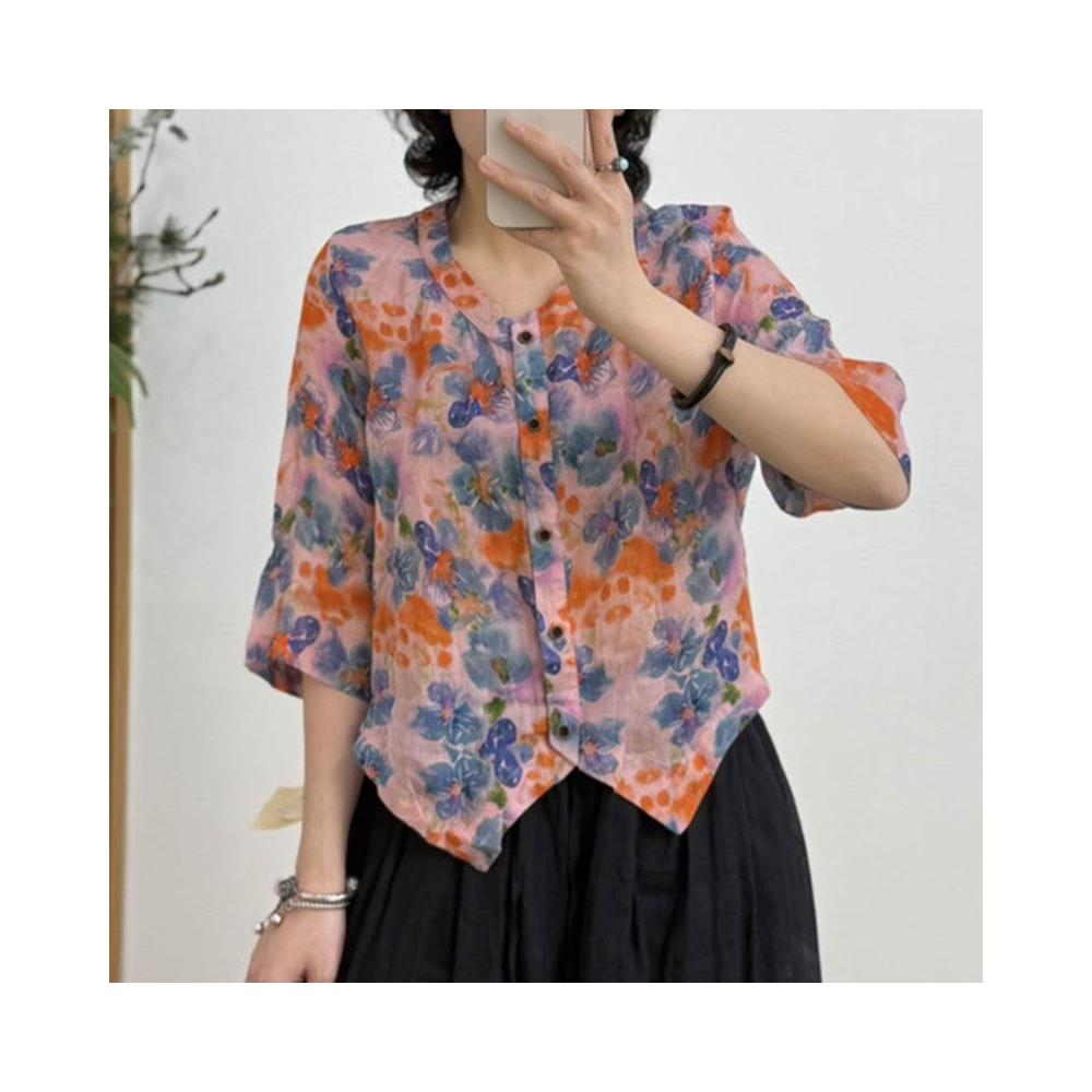 2025夏季新款V領單排扣寬松版七分袖襯衫時尚印花苎麻襯衣女