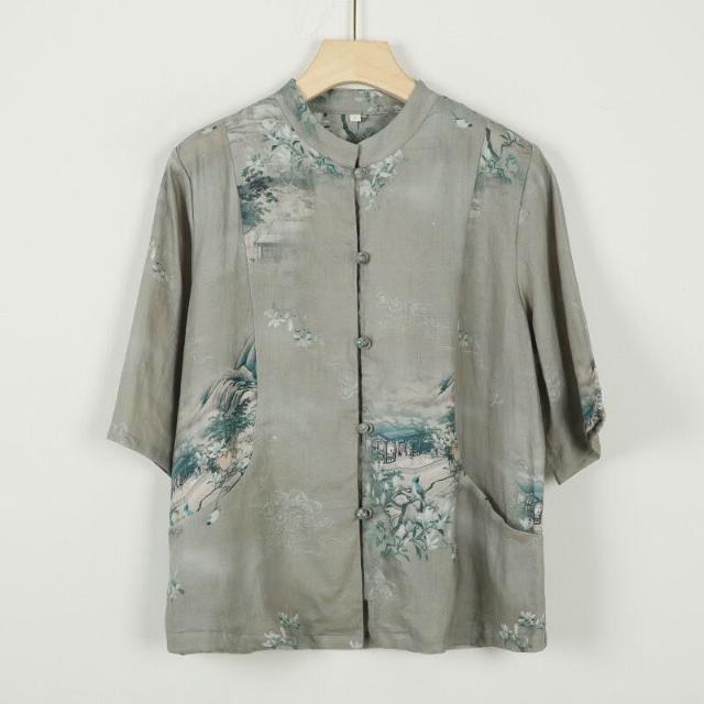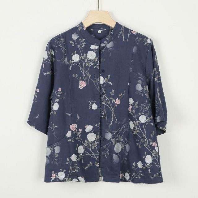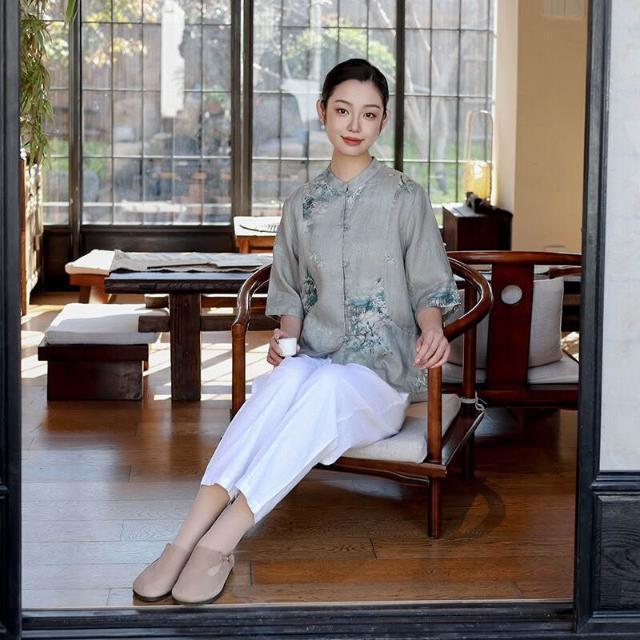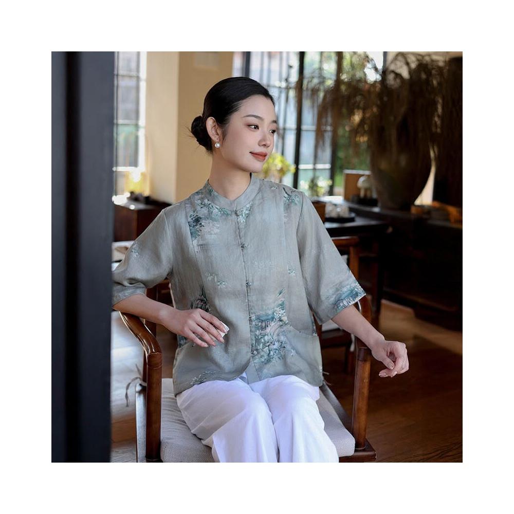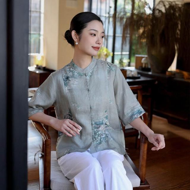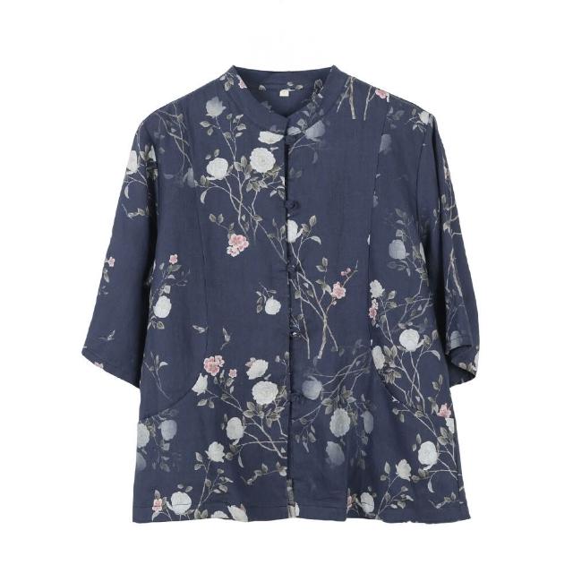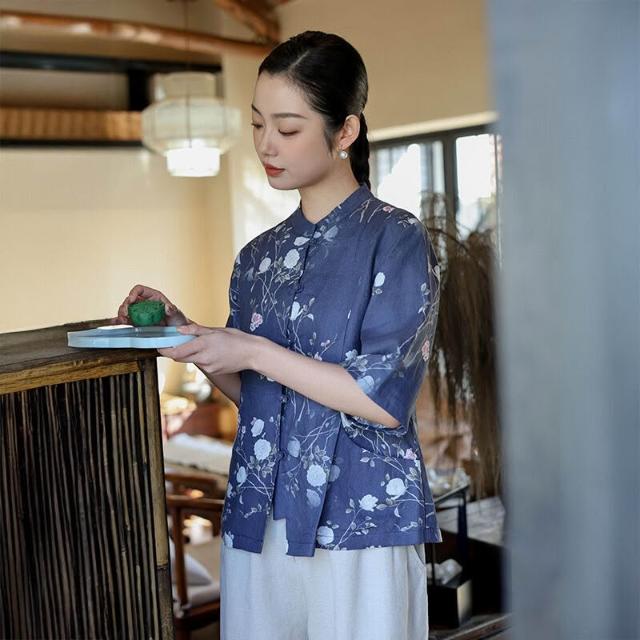 新中式女裝2025春夏新款亞麻印花襯衫女中國風復古盤扣開衫上衣