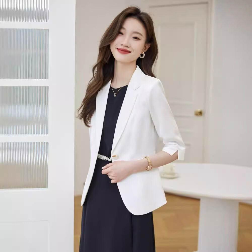 薄款白色休閑西裝外套女夏季時尚小個子氣質七分袖西服連衣裙套裝