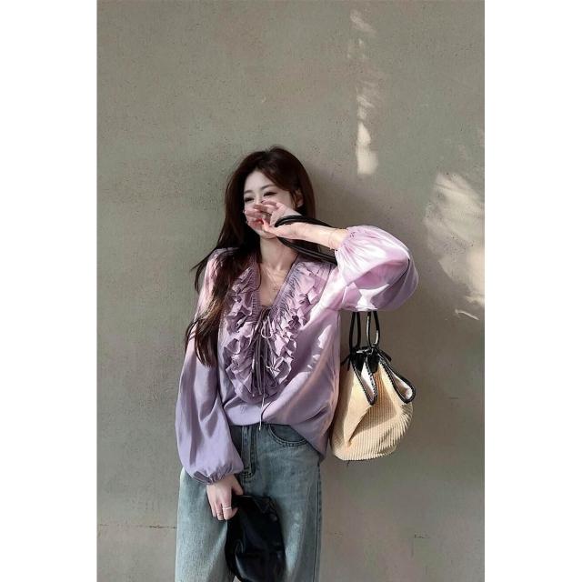 法式高級感荷葉邊v領襯衫女春季紫色長袖襯衣慵懶風寬松休閑上衣