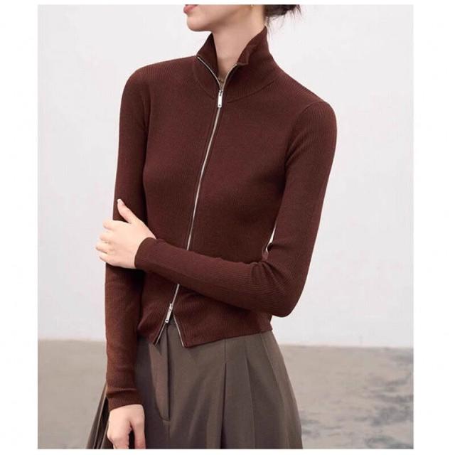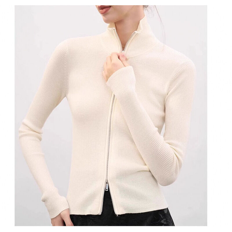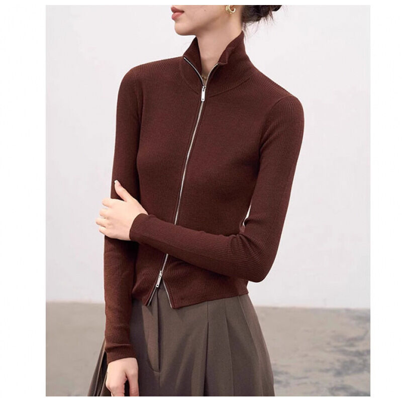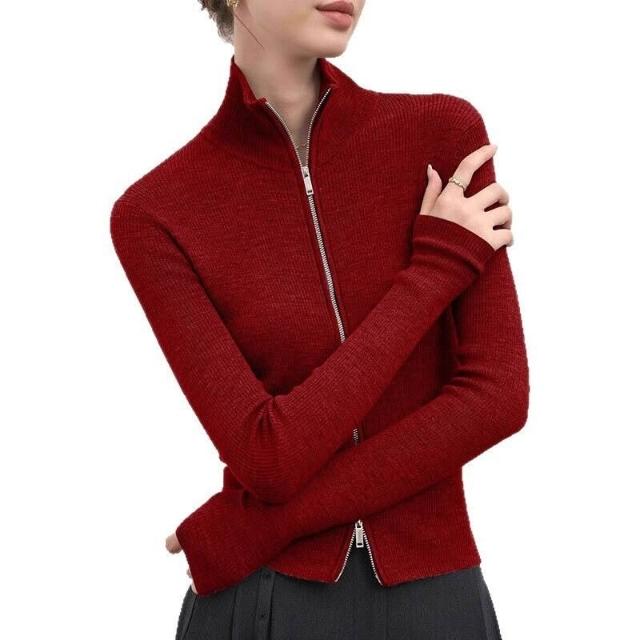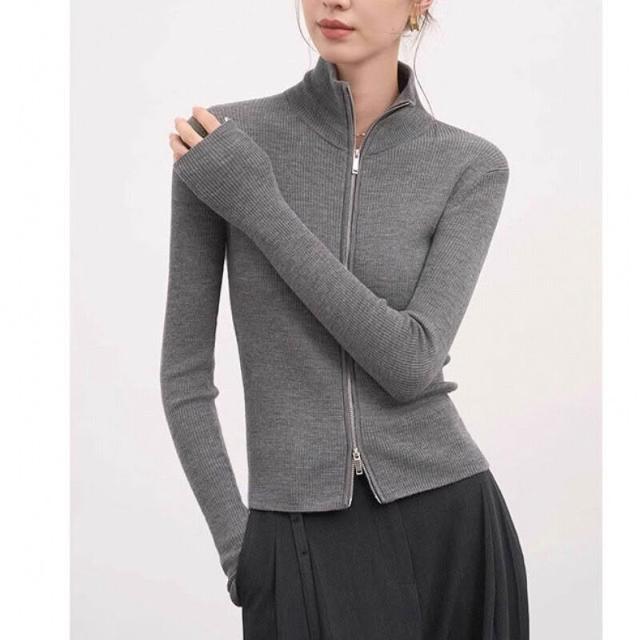 灰色立領雙拉鏈針織開衫外套女2025秋冬新款復古修身打底毛衣上衣