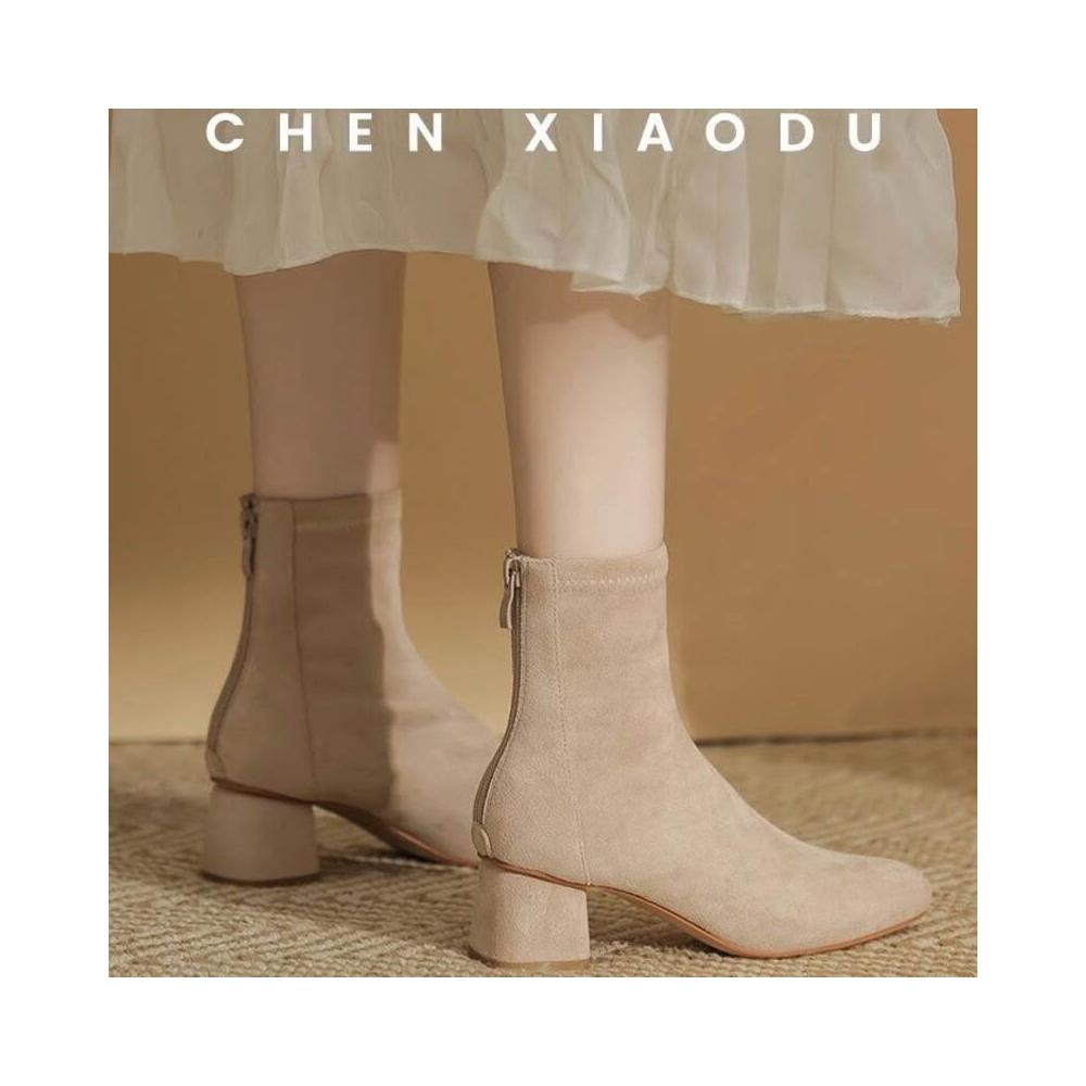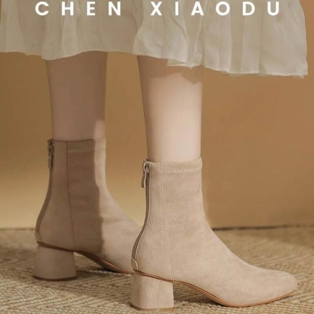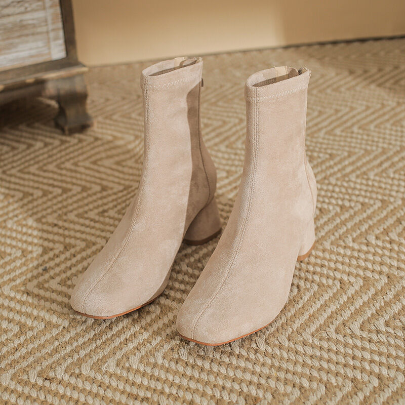 短靴女炸街小短靴瘦瘦靴絨面法式裸色春夏顯高粗跟小個子高跟裸靴
