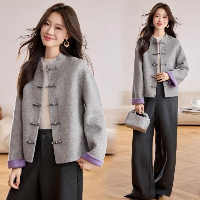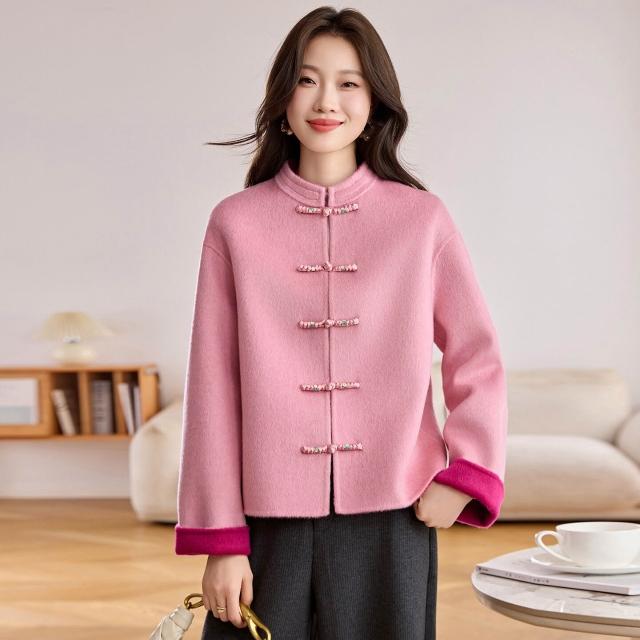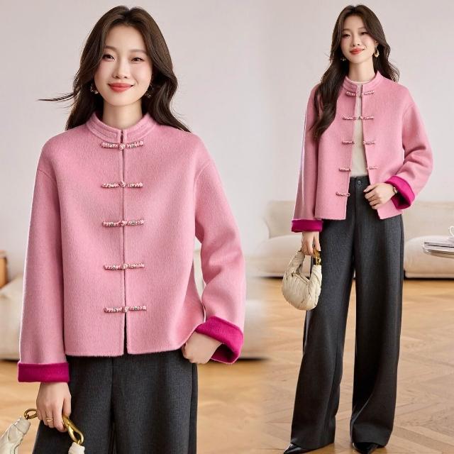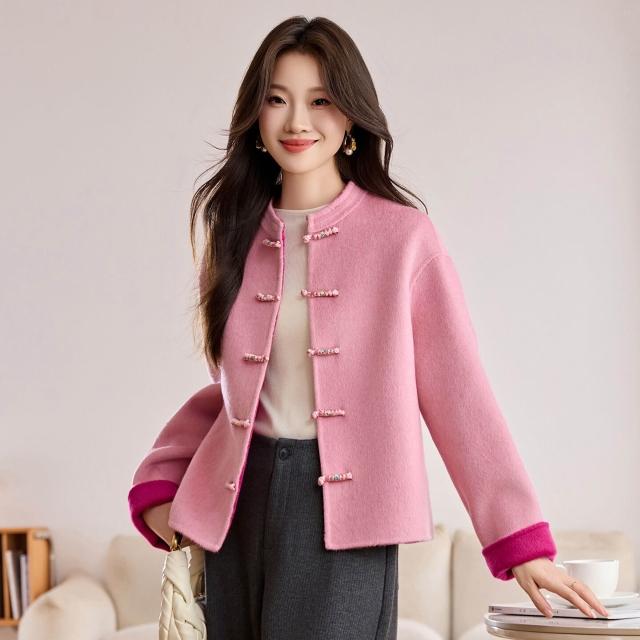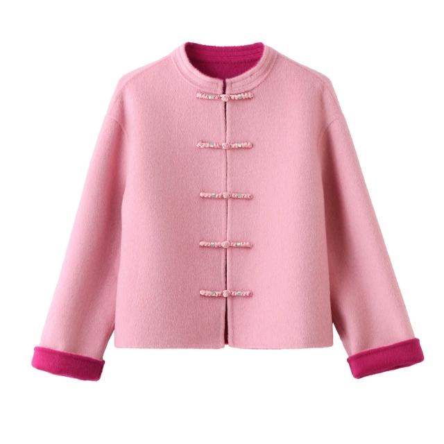 新中式粉色雙面呢羊毛外套女2025秋冬季新款短款盤扣國風毛呢大衣