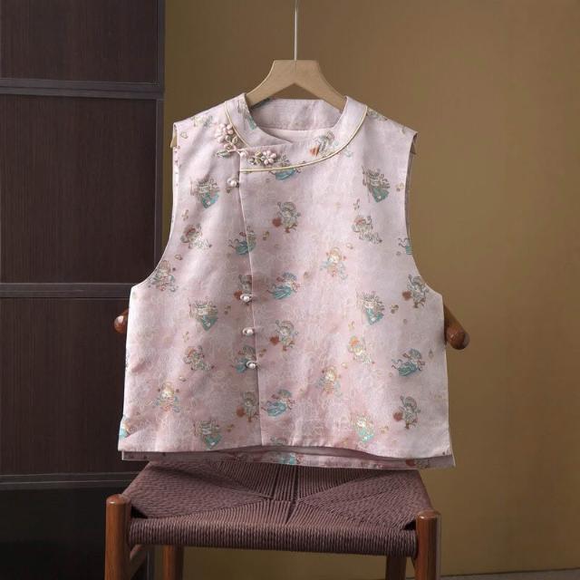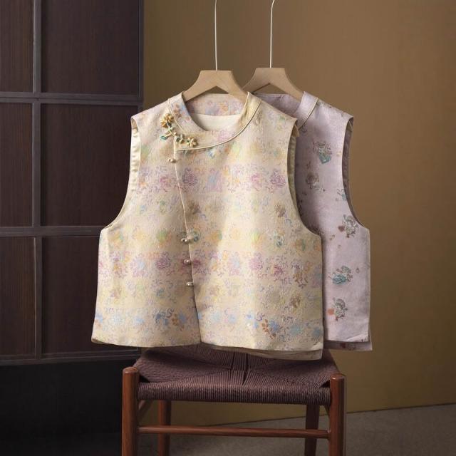 真絲宋錦提花馬甲女100桑蠶絲織金國風新中式背心外套開衫秋