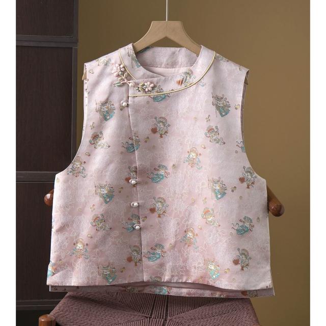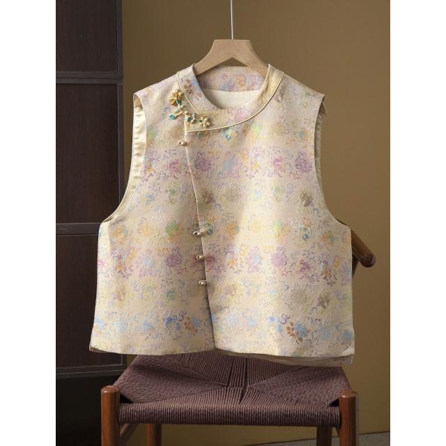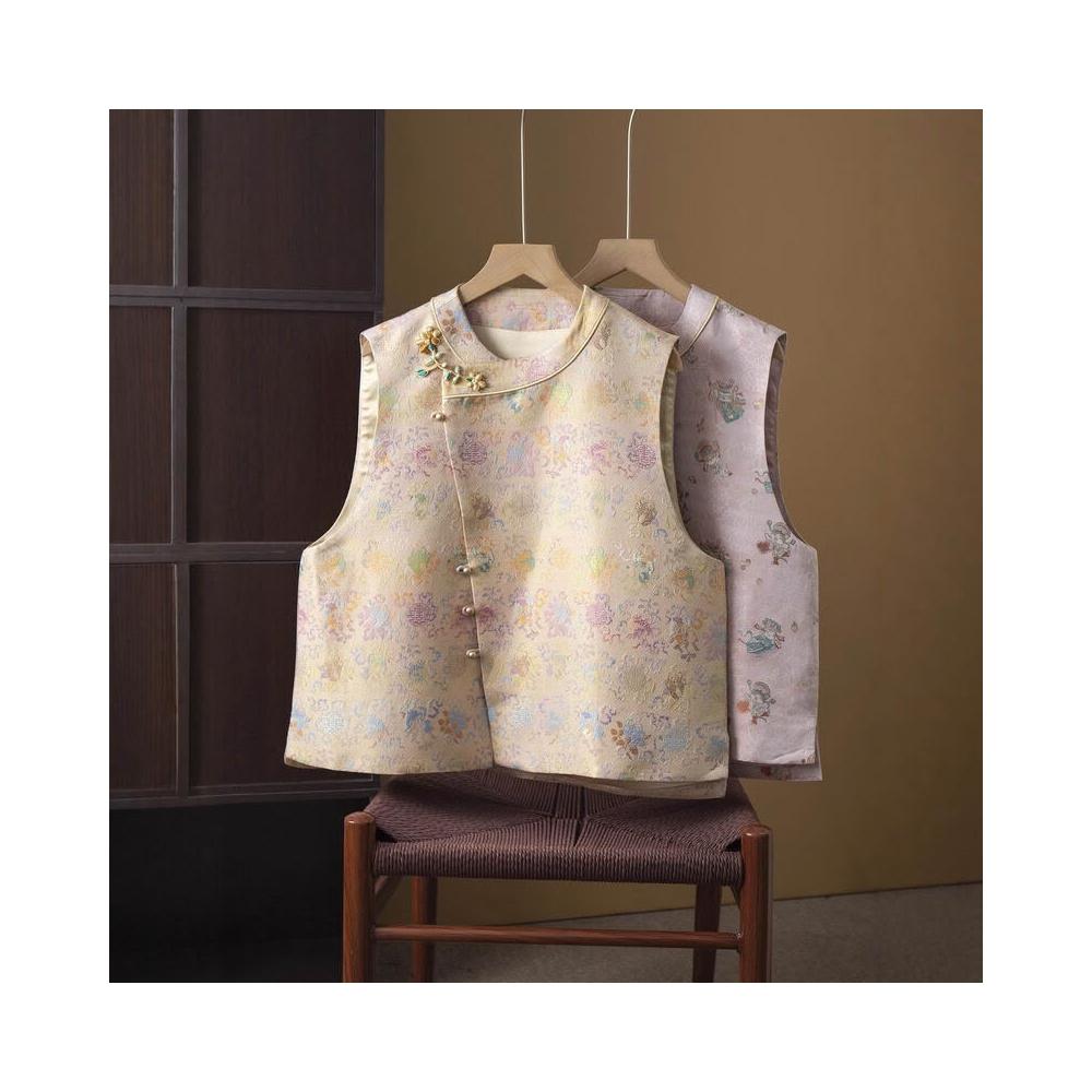 真絲宋錦提花馬甲女100桑蠶絲織金國風新中式背心外套開衫秋
