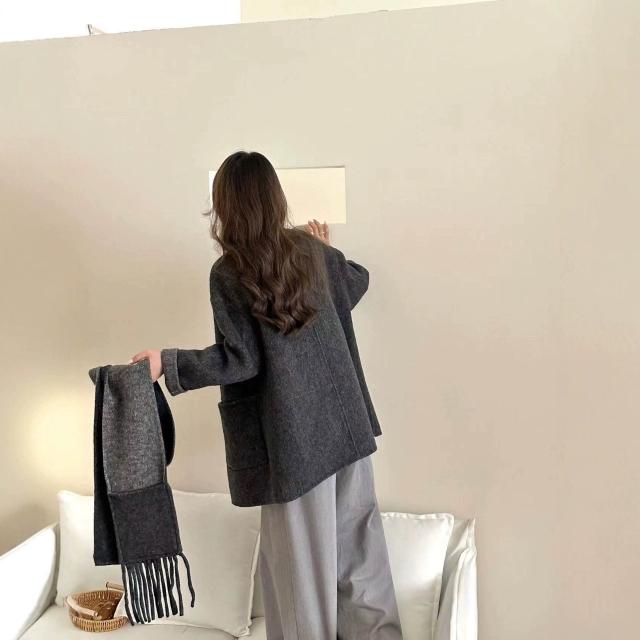 雙色雙面圍巾圓領款單排扣落肩袖大口袋中長款雙面羊毛大衣外套女