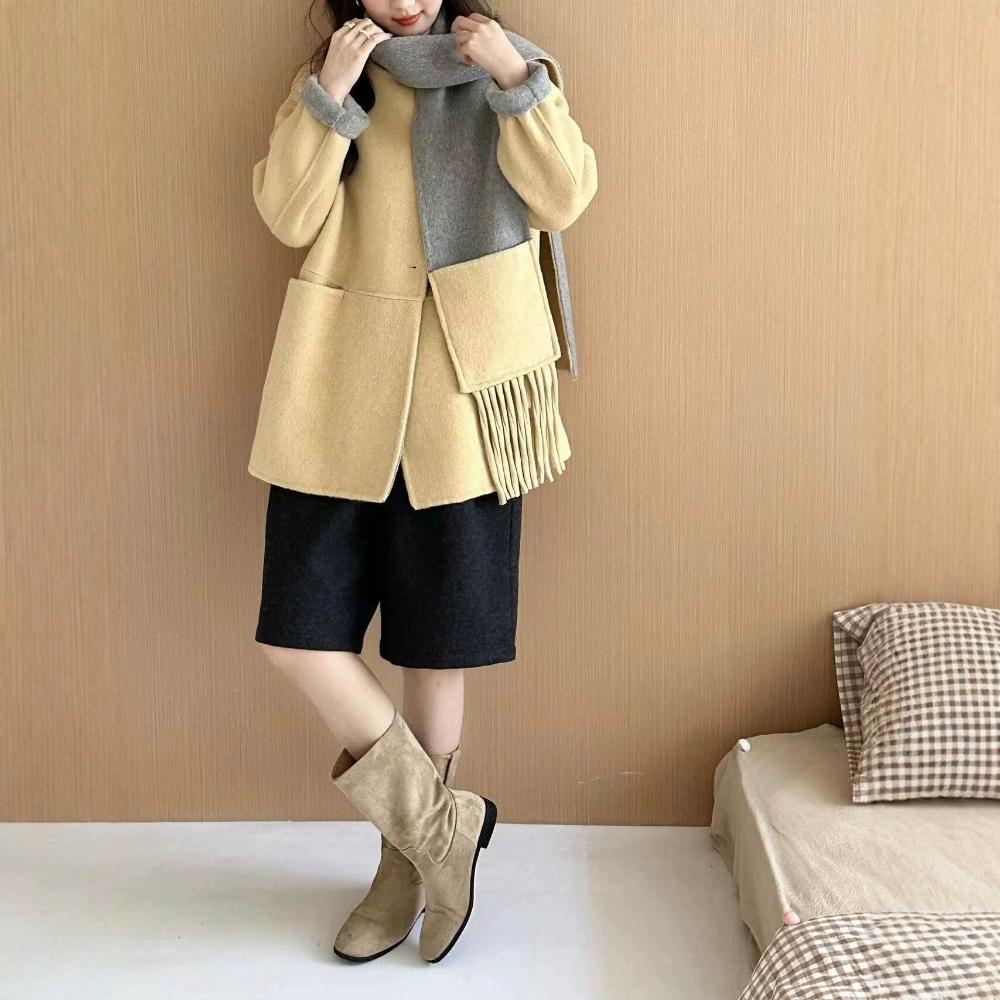 雙色雙面圍巾圓領款單排扣落肩袖大口袋中長款雙面羊毛大衣外套女