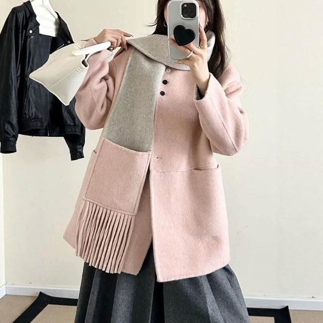雙色雙面圍巾圓領款單排扣落肩袖大口袋中長款雙面羊毛大衣外套女