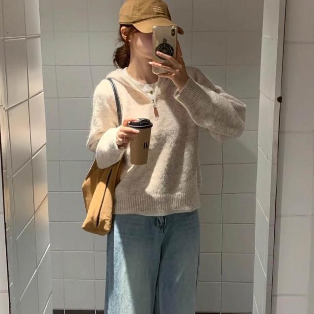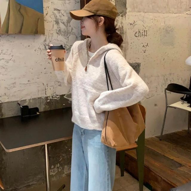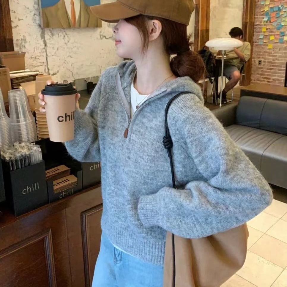 韓系感連帽半拉鏈軟糯毛衣女秋冬新款慵懶百搭套頭針織衫上衣