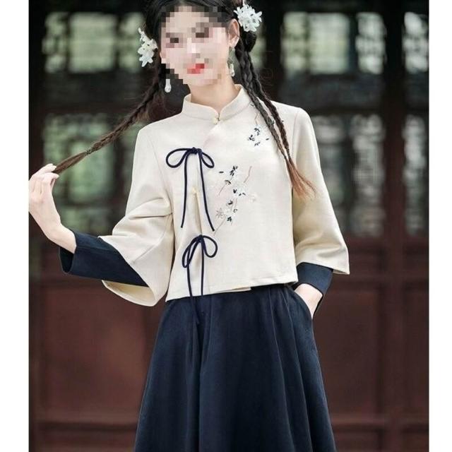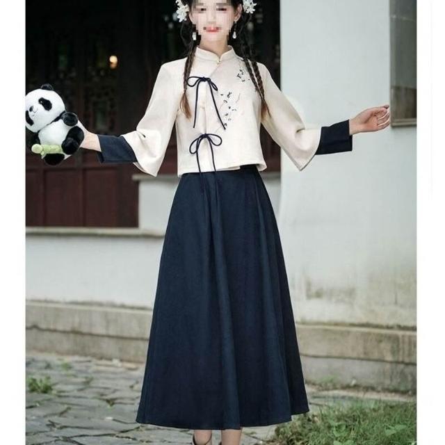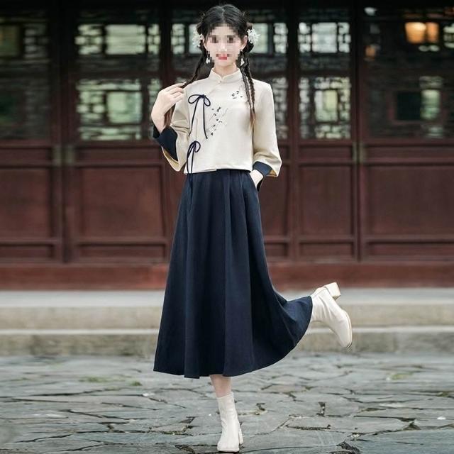 新中式斜襟立領旗袍改良新款漢服長袖上衣茶服國風半身裙套裝唐裝