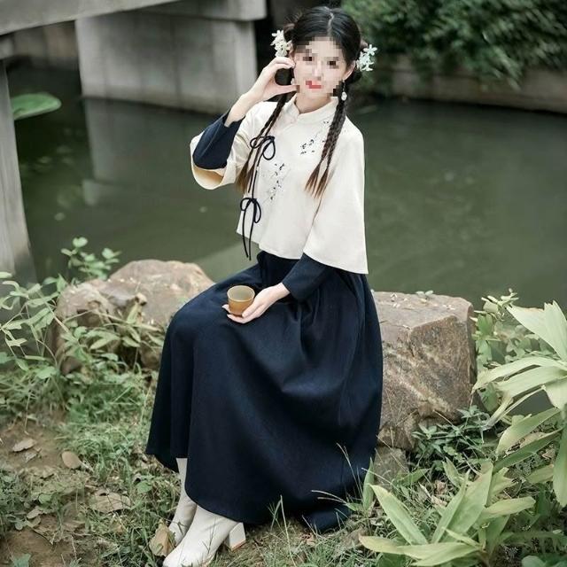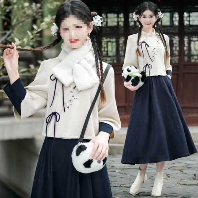 新中式斜襟立領旗袍改良新款漢服長袖上衣茶服國風半身裙套裝唐裝