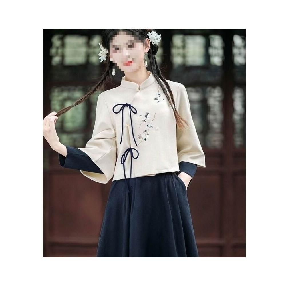 新中式斜襟立領旗袍改良新款漢服長袖上衣茶服國風半身裙套裝唐裝