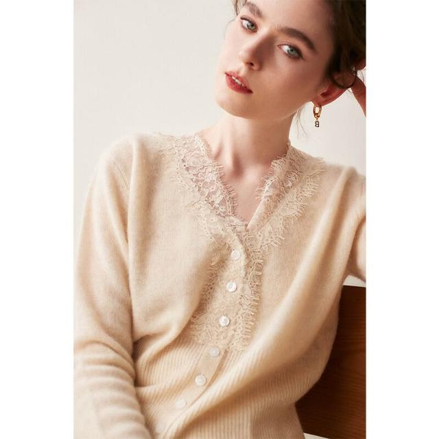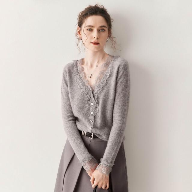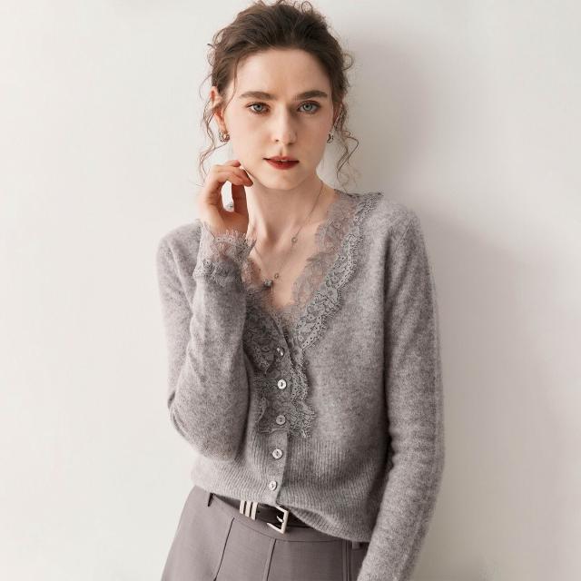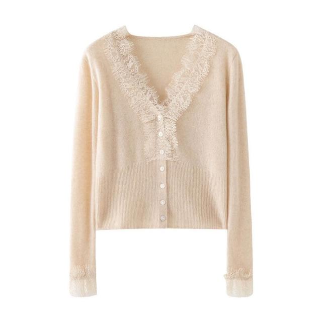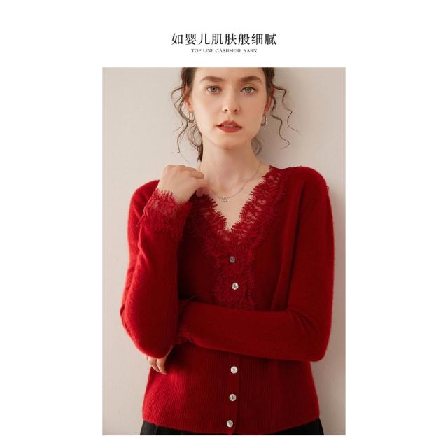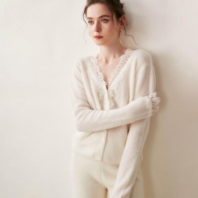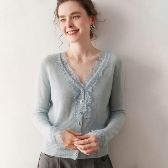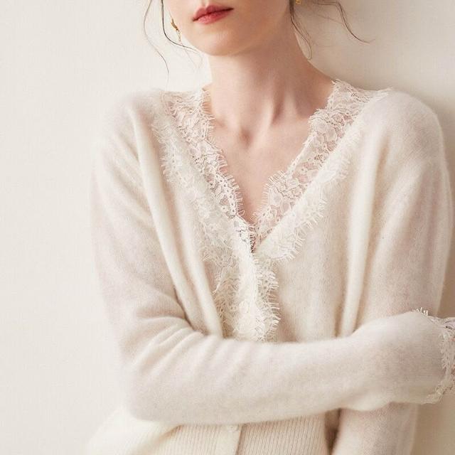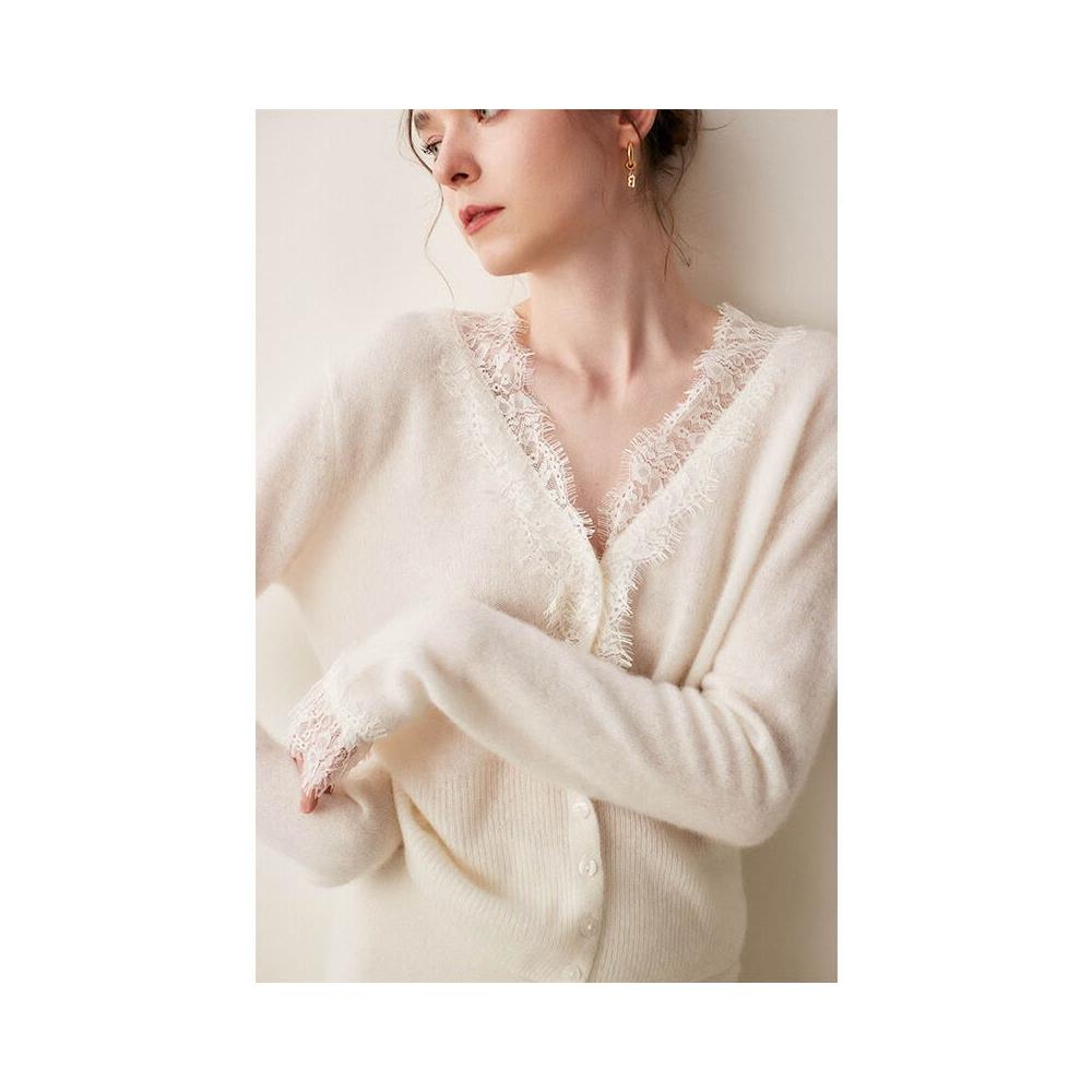 蕾絲花邊山羊絨開衫女V領短款毛衣外套針織羊毛開衫長袖秋冬新款