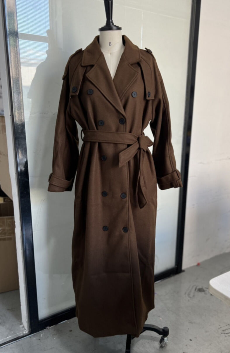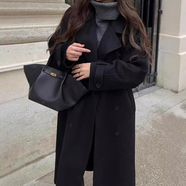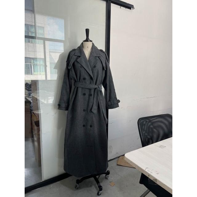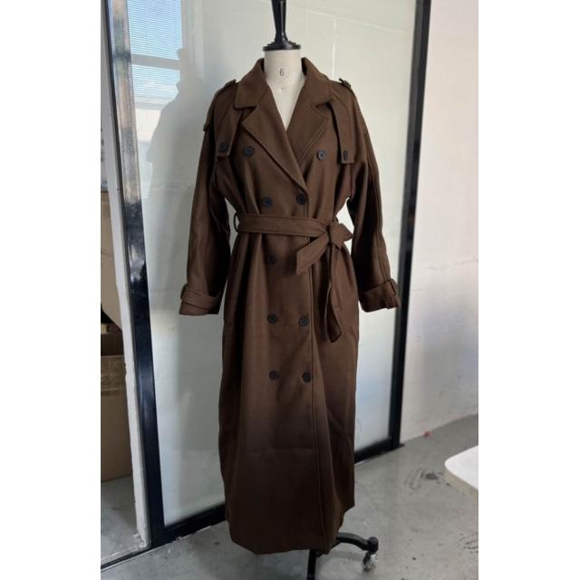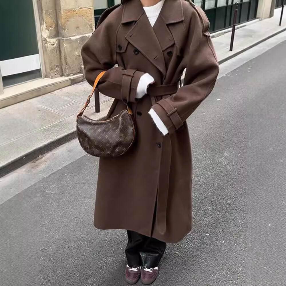 氣質翻領長款收腰系帶毛呢大衣外套女