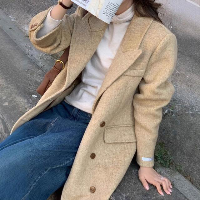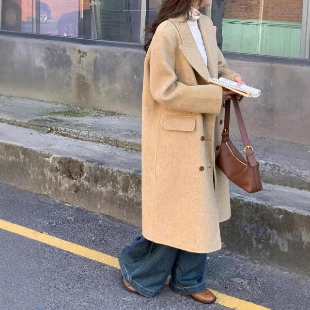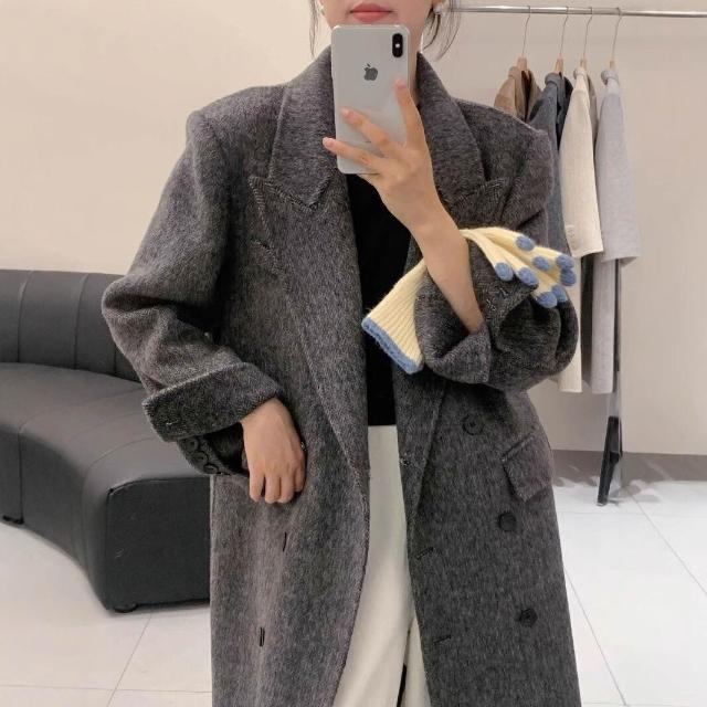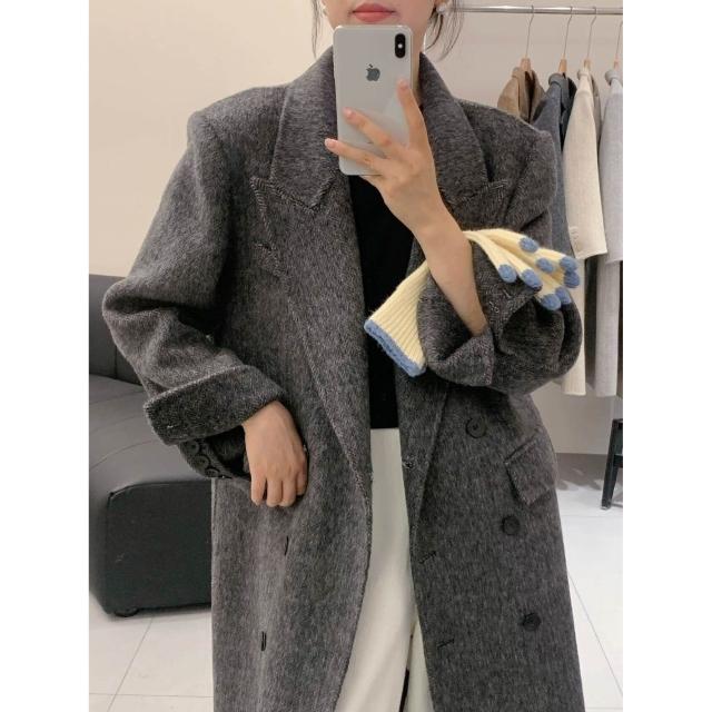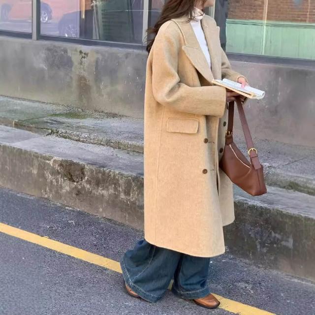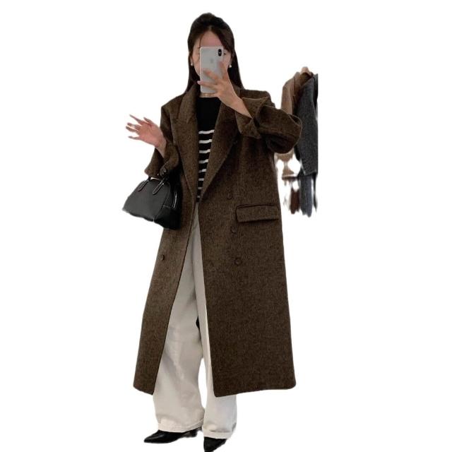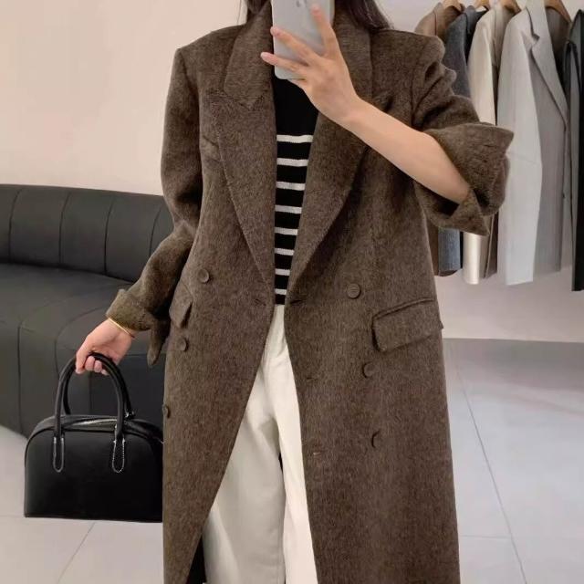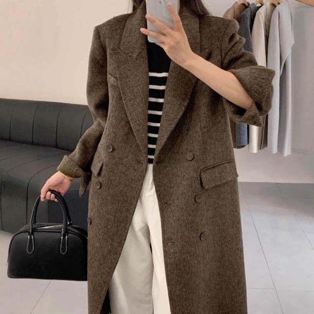 秋冬新款人字紋墊肩西裝領雙面呢女雙排扣加長款顯瘦外套羊毛大衣